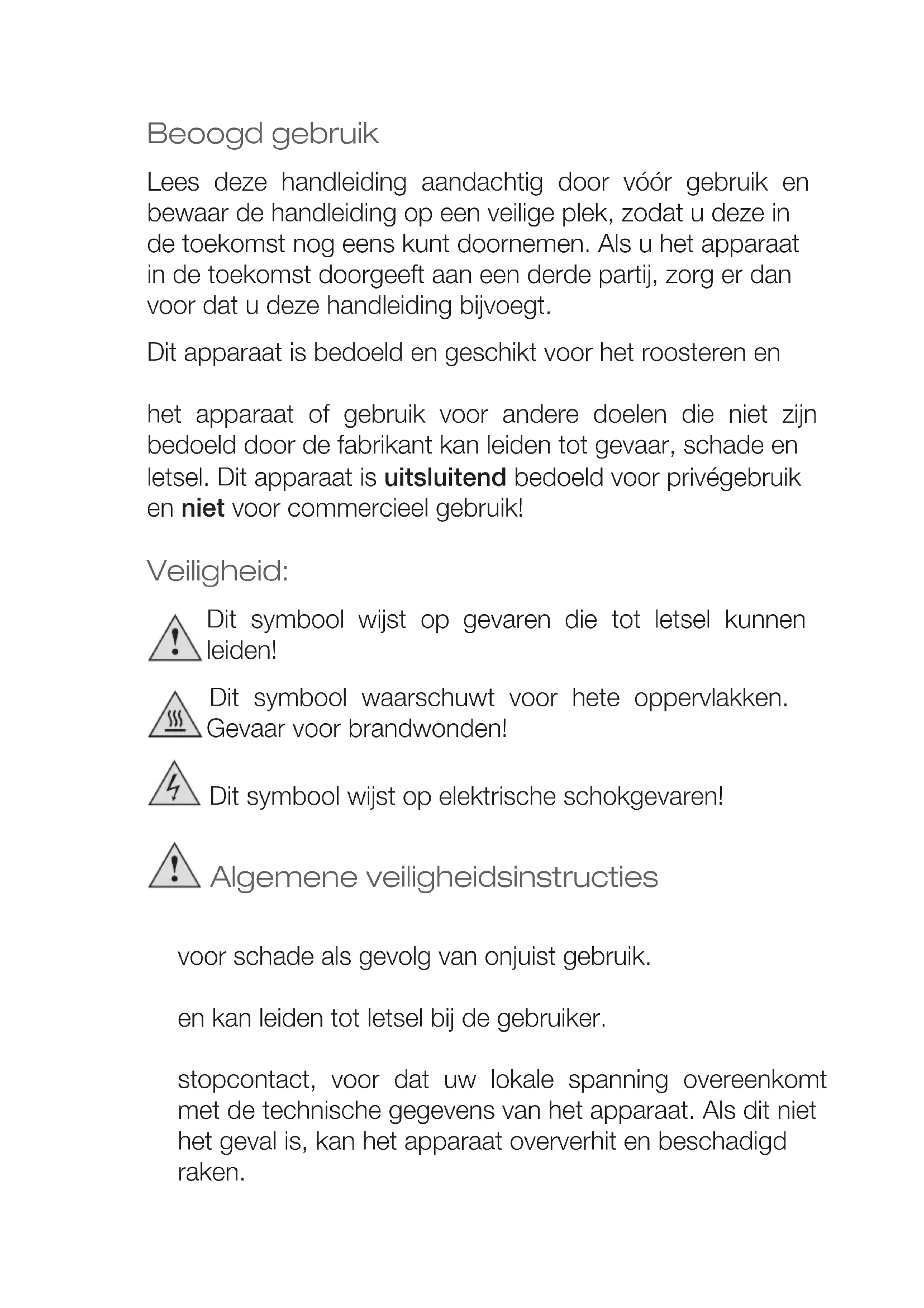 - fordamagescausedbyowner This guarantee does not affect your statutory right, nor any legal right you may have as a costumer under applicable national legislation governing the purchase of goods. Inordertoasserthis/herrightinaguaranteecaseduringthe guaranteed period, the customer must provide evidence of thedateofpurchase(receipt). The guarantee is to be asserted against KORONA electric GmbH, Sundern/Germany. Service Address: KORONA Service, Am Steinbach 9, 59872 Meschede, Germany Telephone Hotline: 02933 90284-80 Mail: service@korona-electric.de web: www.korona-electric.de within 2 years after the date of purchase. In case of guarantee the customer is given the right to get the appliance repaired atourownoratanauthorizedshop.Furtherrights(dueto guaranteecase)arenotgiventothecustomer.28 Beoogd gebruik Lees deze handleiding aandachtig door vóór gebruik en bewaar de handleiding op een veilige plek, zodat u deze in de toekomst nog eens kunt doornemen. Als u het apparaat in de toekomst doorgeeft aan een derde partij, zorg er dan voor dat u deze handleiding bijvoegt. Dit apparaat is bedoeld en geschikt voor het roosteren en opwarmenvanbroodofbroodjes/croissants.Wijzigingvan het apparaat of gebruik voor andere doelen die niet zijn bedoeld door de fabrikant kan leiden tot gevaar, schade en letsel. Dit apparaat is uitsluitend bedoeld voor privégebruik en niet voor commercieel gebruik! Veiligheid: Dit symbool wijst op gevaren die tot letsel kunnen leiden! Dit symbool waarschuwt voor hete oppervlakken. Gevaar voor brandwonden! Dit symbool wijst op elektrische schokgevaren! Algemene veiligheidsinstructies