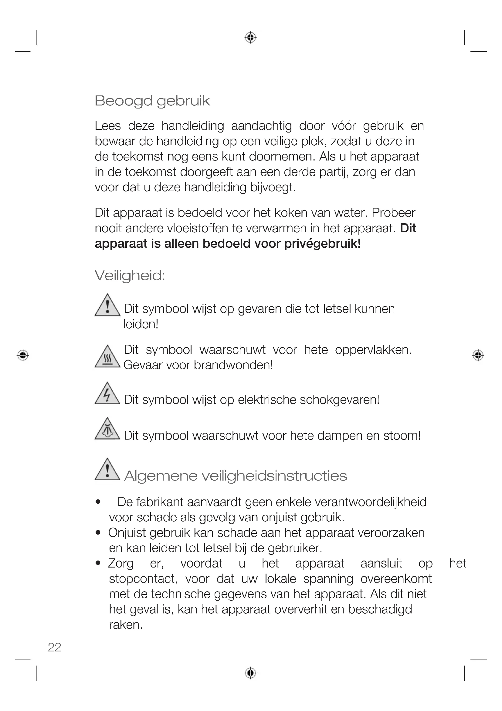 - fordamagescausedbyowner This guarantee does not affect your statutory right, nor any legal right you may have as a costumer under applicable national legislation governing the purchase of goods. Inordertoasserthis/herrightinaguaranteecaseduringthe guaranteed period, the customer must provide evidence of thedateofpurchase(receipt). The guarantee is to be asserted against KORONA electric GmbH, Sundern/Germany. Service Address: KORONA Service, Am Steinbach 9, 59872 Meschede, Germany Telephone Hotline: 02933 90284-80 Mail: service@korona-electric.de web: www.korona-electric.de within 2 years after the date of purchase. In case of guarantee the customer is given the right to get the appliance repaired atourownoratanauthorizedshop.Furtherrights(dueto guaranteecase)arenotgiventothecustomer.22 Beoogd gebruik Lees deze handleiding aandachtig door vóór gebruik en bewaar de handleiding op een veilige plek, zodat u deze in de toekomst nog eens kunt doornemen. Als u het apparaat in de toekomst doorgeeft aan een derde partij, zorg er dan voor dat u deze handleiding bijvoegt. Dit apparaat is bedoeld voor het koken van water. Probeer nooit andere vloeistoffen te verwarmen in het apparaat. Dit apparaat is alleen bedoeld voor privégebruik! Veiligheid: Dit symbool wijst op gevaren die tot letsel kunnen leiden! Dit symbool waarschuwt voor hete oppervlakken. Gevaar voor brandwonden! Dit symbool wijst op elektrische schokgevaren! Dit symbool waarschuwt voor hete dampen en stoom! Algemene veiligheidsinstructies