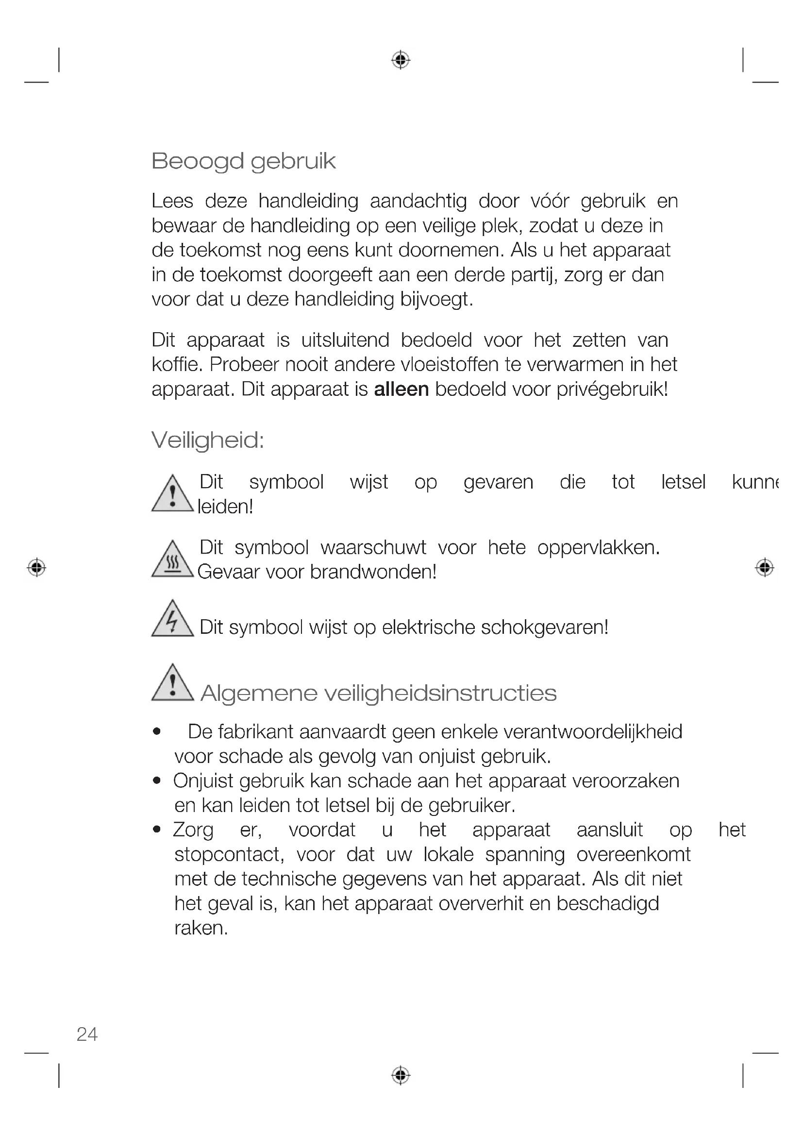 - fordamagescausedbyowner This guarantee does not affect your statutory right, nor any legal right you may have as a costumer under applicable national legislation governing the purchase of goods. Inordertoasserthis/herrightinaguaranteecaseduringthe guaranteed period, the customer must provide evidence of thedateofpurchase(receipt). The guarantee is to be asserted against KORONA electric GmbH, Sundern/Germany. Service Address: KORONA Service, Am Steinbach 9, 59872 Meschede, Germany Telephone Hotline: 02933 90284-80 Mail: service@korona-electric.de web: www.korona-electric.de within 2 years after the date of purchase. In case of guarantee the customer is given the right to get the appliance repaired atourownoratanauthorizedshop.Furtherrights(dueto guaranteecase)arenotgiventothecustomer.24 Beoogd gebruik Lees deze handleiding aandachtig door vóór gebruik en bewaar de handleiding op een veilige plek, zodat u deze in de toekomst nog eens kunt doornemen. Als u het apparaat indetoekomstdoorgeeftaaneenderdepartij,zorgerdan voordatudezehandleidingbijvoegt. Dit apparaat is uitsluitend bedoeld voor het zetten van koffie. Probeer nooit andere vloeistoffen te verwarmen in het apparaat. Dit apparaat is alleen bedoeld voor privégebruik! Veiligheid: Dit symbool wijst op gevaren die tot letsel kunnen leiden! Dit symbool waarschuwt voor hete oppervlakken. Gevaar voor brandwonden! Ditsymboolwijstopelektrischeschokgevaren! Algemene veiligheidsinstructies