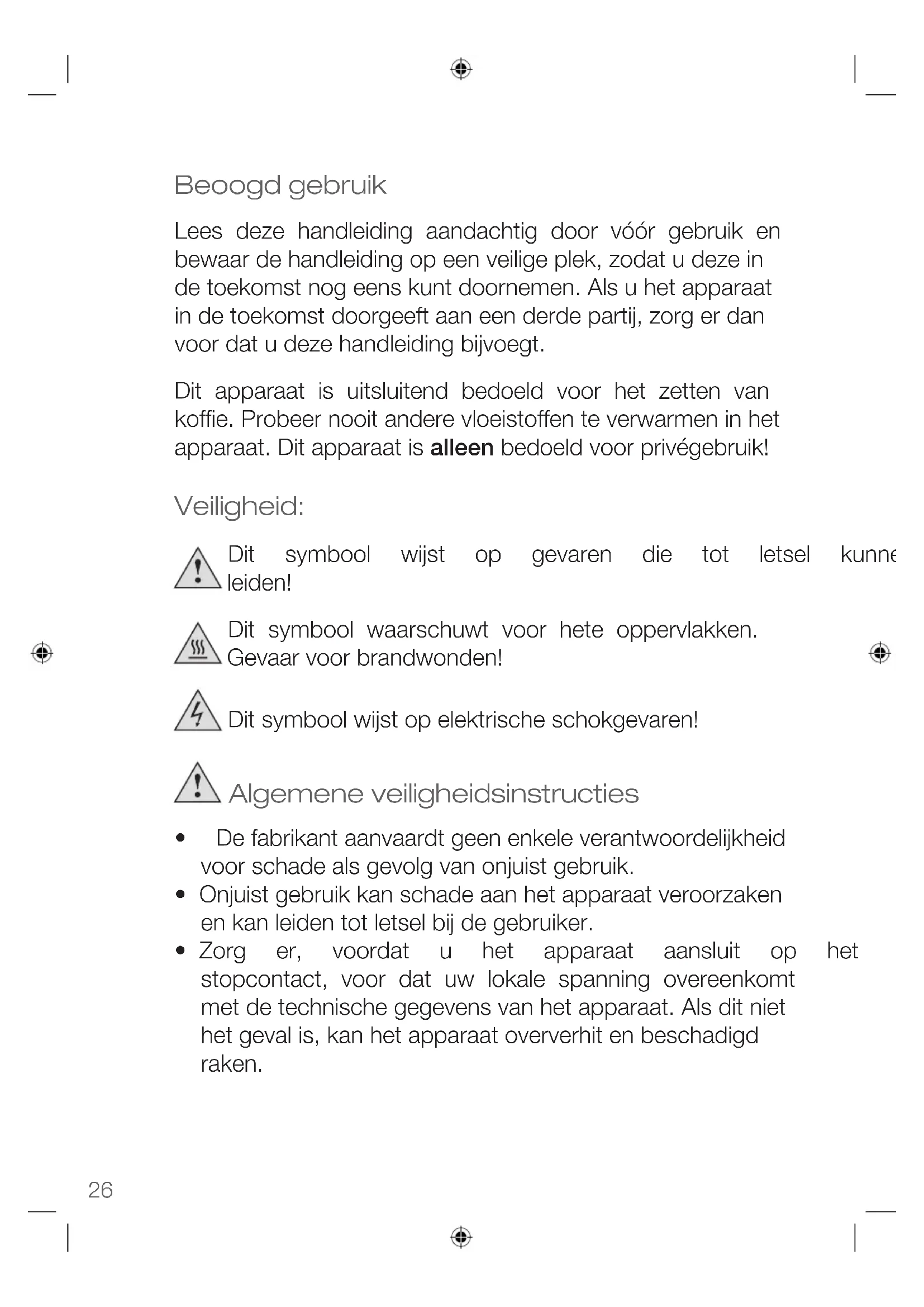 - fordamagescausedbyowner This guarantee does not affect your statutory right, nor any legal right you may have as a costumer under applicable national legislation governing the purchase of goods. Inordertoasserthis/herrightinaguaranteecaseduringthe guaranteed period, the customer must provide evidence of the date of purchase (receipt). The guarantee is to be asserted against KORONA electric GmbH, Sundern/Germany. Service Address: KORONA Service, Am Steinbach 9, 59872 Meschede, Germany Telephone Hotline: 02933 90284-80 Mail: service@korona-electric.de web: www.korona-electric.de within 2 years after the date of purchase. In case of guarantee the customer is given the right to get the appliance repaired at our own or at an authorized shop. Further rights (due to guarantee case) are not given to the customer.26 Beoogd gebruik Lees deze handleiding aandachtig door vóór gebruik en bewaar de handleiding op een veilige plek, zodat u deze in de toekomst nog eens kunt doornemen. Als u het apparaat indetoekomstdoorgeeftaaneenderdepartij,zorgerdan voordatudezehandleidingbijvoegt. Dit apparaat is uitsluitend bedoeld voor het zetten van koffie. Probeer nooit andere vloeistoffen te verwarmen in het apparaat. Dit apparaat is alleen bedoeld voor privégebruik! Veiligheid: Dit symbool wijst op gevaren die tot letsel kunnen leiden! Dit symbool waarschuwt voor hete oppervlakken. Gevaar voor brandwonden! Ditsymboolwijstopelektrischeschokgevaren! Algemene veiligheidsinstructies