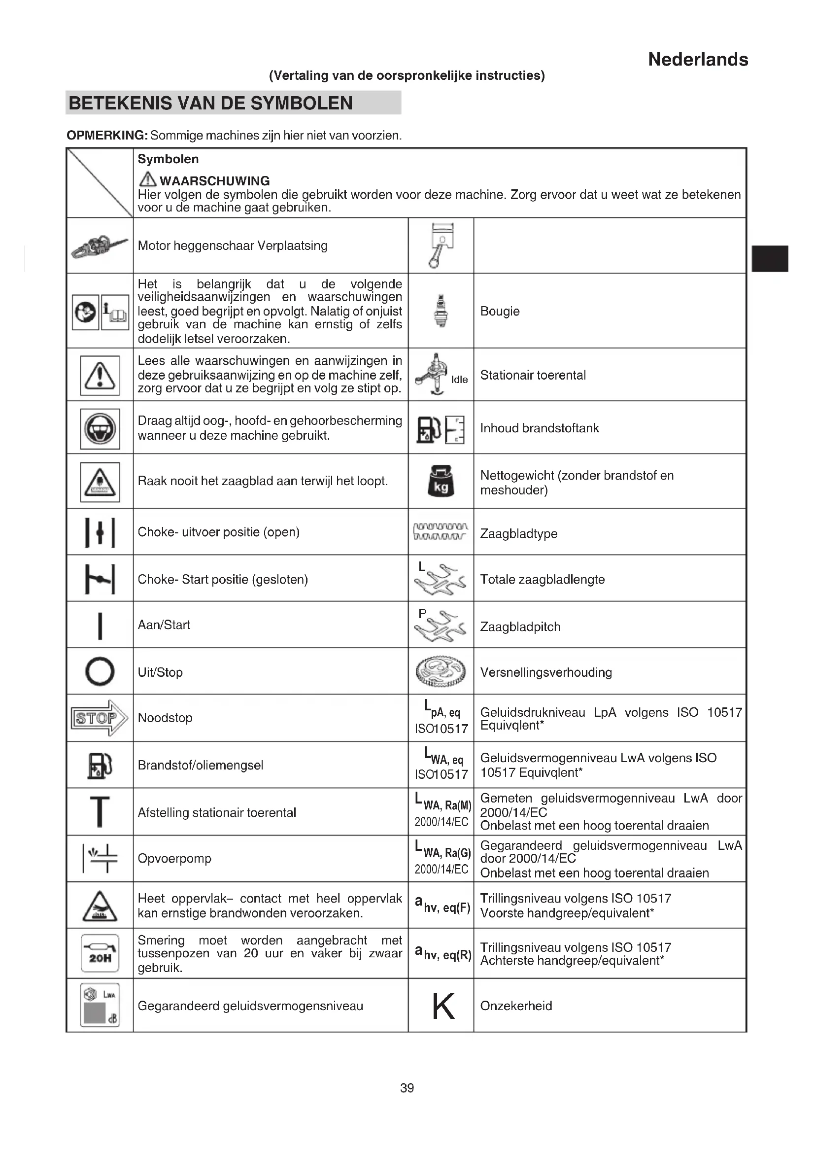 OPMERKING: Sommige machines zijn hier niet van voorzien. Symbolen WAARSCHUWING Hier volgen de symbolen die gebruikt worden voor deze machine. Zorg ervoor dat u weet wat ze betekenen voor u de machine gaat gebruiken. Motor heggenschaar Verplaatsing Het is belangrijk dat u de volgende veiligheidsaanwijzingen en waarschuwingen leest, goed begrijpt en opvolgt. Nalatig of onjuist gebruik van de machine kan ernstig of zelfs dodelijk letsel veroorzaken. Bougie Lees alle waarschuwingen en aanwijzingen in deze gebruiksaanwijzing en op de machine zelf, zorg ervoor dat u ze begrijpt en volg ze stipt op. Idle Stationair toerental Draag altijd oog-, hoofd- en gehoorbescherming wanneer u deze machine gebruikt. Inhoud brandstoftank Raak nooit het zaagblad aan terwijl het loopt. Nettogewicht (zonder brandstof en meshouder) Choke- uitvoer positie (open) Zaagbladtype Choke- Start positie (gesloten)