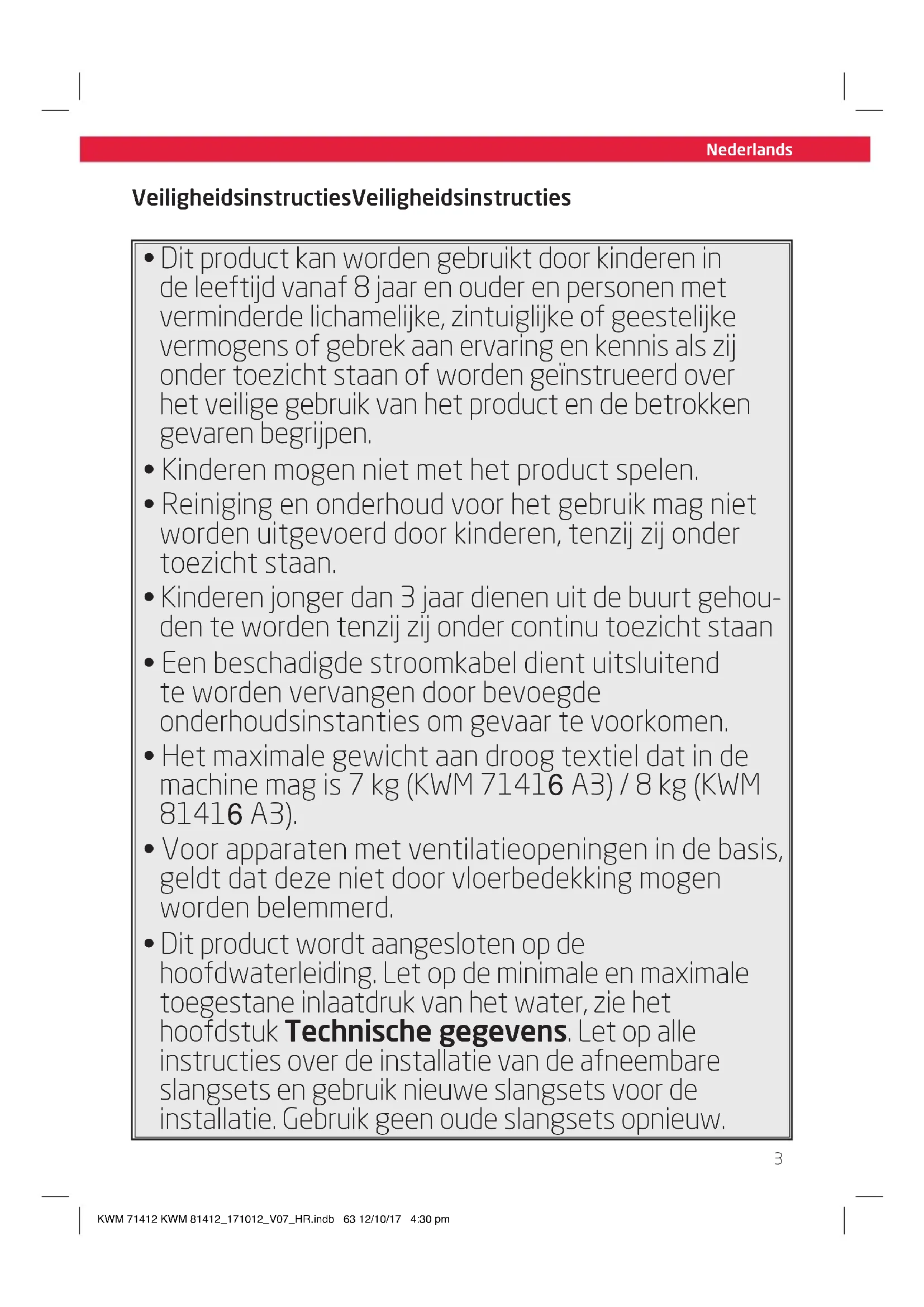 De maximale centrifugesnelheid voor het standaard katoenprogramma op 60 °C bij volledige lading of het standaard katoenprogramma op 40 °C bij gedeeltelijke lading, indien deze lager is, en het resterend vochtgehalte voor het standaard katoenprogramma op 60 °C bij volledige lading of het standaard katoenprogramma op 40 °C bij gedeeltelijke lading, indien dit hoger is 1400 rpm KWM 71412 KWM 81412_171012_V07_HR.indb 85 12/10/17 4:30 pm52 Nederlands Size - A5 Typeaanduiding KWM 71416 A3 KWM 81416 A3