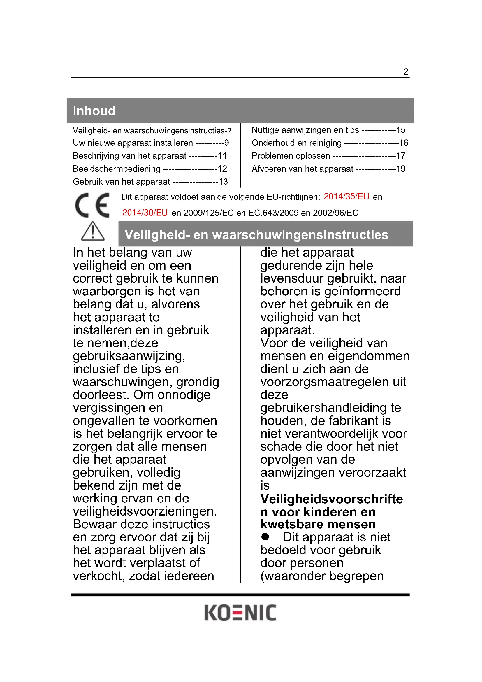 Inhoud Veiligheid- en waarschuwingensinstructies-2 Uw nieuwe apparaat installeren ----------9 Beschrijving van het apparaat ----------11 Beeldschermbediening -------------------12 Gebruik van het apparaat ----------------13 Nuttige aanwijzingen en tips ------------15 Onderhoud en reiniging -------------------16 Problemen oplossen ----------------------17 Afvoeren van het apparaat --------------19 Dit apparaat voldoet aan Veiligheid- en waarschuwingensinstructies In het belang van uw veiligheid en om een correct gebruik te kunnen waarborgen is het van belang dat u, alvorens het apparaat te installeren en in gebruik te nemen,deze gebruiksaanwijzing, inclusief de tips en waarschuwingen, grondig doorleest. Om onnodige vergissingen en ongevallen te voorkomen is het belangrijk ervoor te zorgen dat alle mensen die het apparaat gebruiken, volledig bekend zijn met de werking ervan en de veiligheidsvoorzieningen. Bewaar deze instructies en zorg ervoor dat zij bij het apparaat blijven als het wordt verplaatst of verkocht, zodat iedereen die het apparaat gedurende zijn hele levensduur gebruikt, naar behoren is geïnformeerd over het gebruik en de veiligheid van het apparaat. Voor de veiligheid van mensen en eigendommen dient u zich aan de voorzorgsmaatregelen uit deze gebruikershandleiding te houden, de fabrikant is niet verantwoordelijk voor schade die door het niet opvolgen van de aanwijzingen veroorzaakt