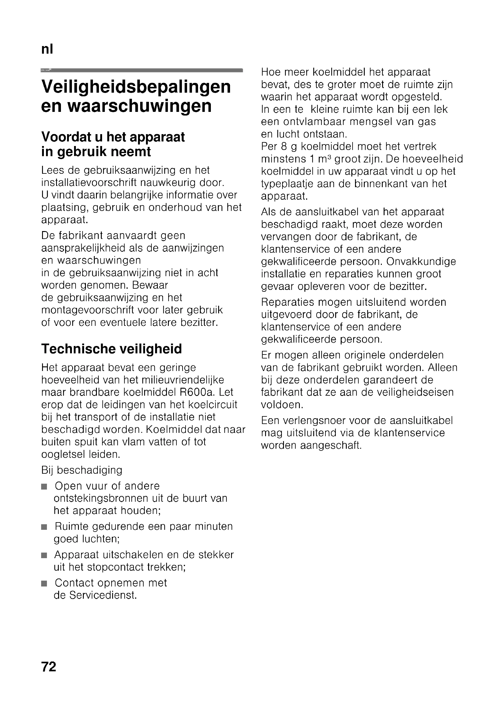 nlIn houd nlGebruiksaanwijzing Veiligheidsbepalingen en waarschuwingen Voordat u het apparaat in gebruik neemt Lees de gebruiksaanwijzing en het installatievoorschrift nauwkeurig door. U vindt daarin belangrijke informatie over plaatsing, gebruik en onderhoud van het apparaat. De fabrikant aanvaardt geen aansprakelijkheid als de aanwijzingen en waarschuwingen in de gebruiksaanwijzing niet in acht worden genomen. Bewaar de gebruiksaanwijzing en het montagevoorschrift voor later gebruik of voor een eventuele latere bezitter. Technische veiligheid Het apparaat bevat een geringe hoeveelheid van het milieuvriendelijke maar brandbare koelmiddel R600a. Let erop dat de leidingen van het koelcircuit bij het transport of de installatie niet beschadigd worden. Koelmiddel dat naar buiten spuit kan vlam vatten of tot oogletsel leiden. Bij beschadiging ■ Open vuur of andere ontstekingsbronnen uit de buurt van het apparaat houden; ■ Ruimte gedurende een paar minuten goed luchten; ■ Apparaat uitschakelen en de stekker uit het stopcontact trekken; ■ Contact opnemen met de Servicedienst. Hoe meer koelmiddel het apparaat bevat, des te groter moet de ruimte zijn waarin het apparaat wordt opgesteld. In een te kleine ruimte kan bij een lek een ontvlambaar mengsel van gas en lucht ontstaan. Per 8 g koelmiddel moet het vertrek minstens 1 m³ groot zijn. De hoeveelheid koelmiddel in uw apparaat vindt u op het typeplaatje aan de binnenkant van het apparaat. Als de aansluitkabel van het apparaat beschadigd raakt, moet deze worden vervangen door de fabrikant, de klantenservice of een andere gekwalificeerde persoon. Onvakkundige installatie en reparaties kunnen groot gevaar opleveren voor de bezitter. Reparaties mogen uitsluitend worden uitgevoerd door de fabrikant, de klantenservice of een andere gekwalificeerde persoon. Er mogen alleen originele onderdelen van de fabrikant gebruikt worden. Alleen bij deze onderdelen garandeert de fabrikant dat ze aan de veiligheidseisen voldoen. Een verlengsnoer voor de aansluitkabel mag uitsluitend via de klantenservice worden aangeschaft.nl