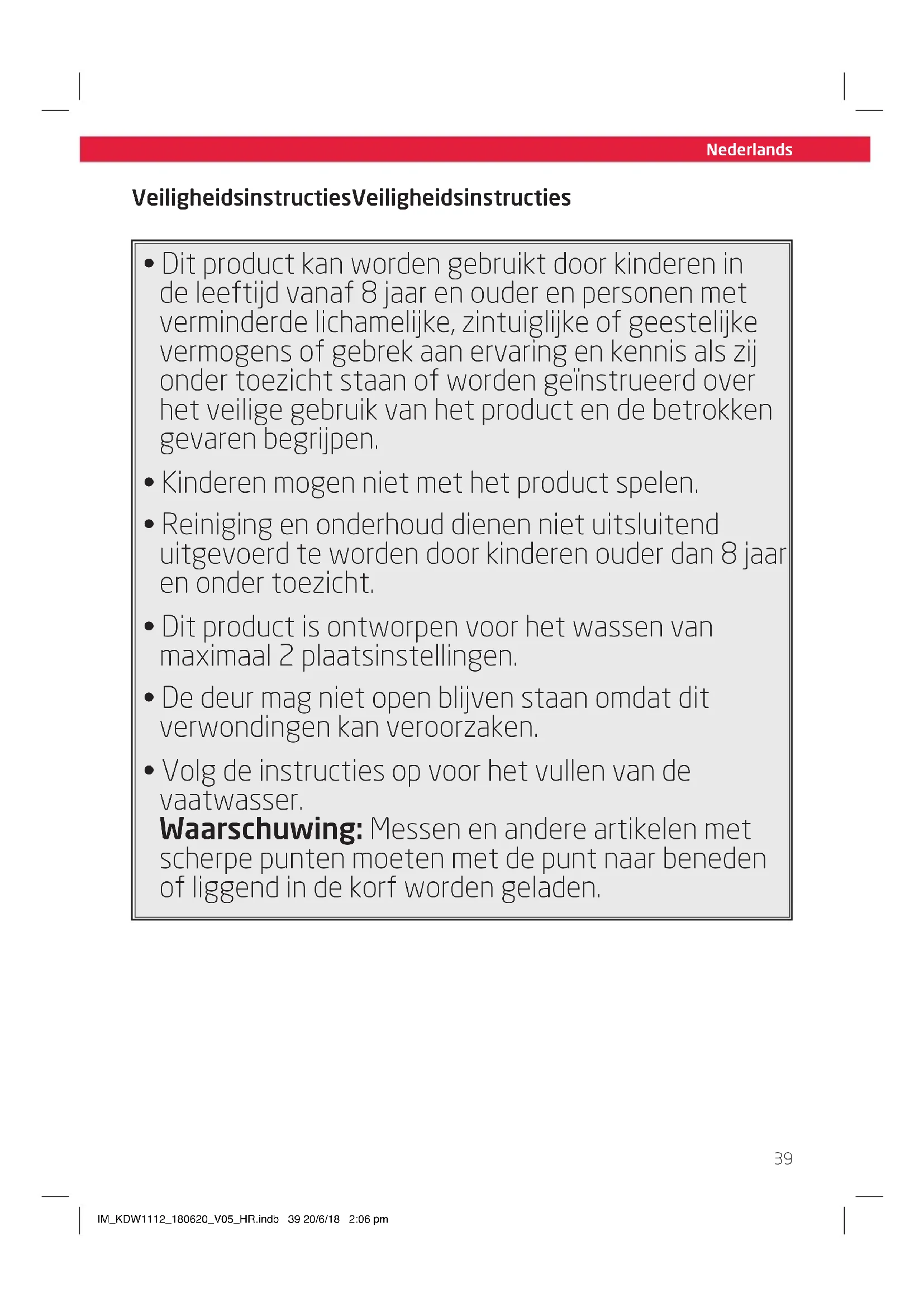 - Volg de instructies op voor het vullen van de vaatwasser. Waarschuwing: Messen en andere artikelen met scherpe punten moeten met de punt naar beneden of liggend in de korf worden geladen. IM_KDW1112_180620_V05_HR.indb 39 20/6/18 2:06 pmNederlands