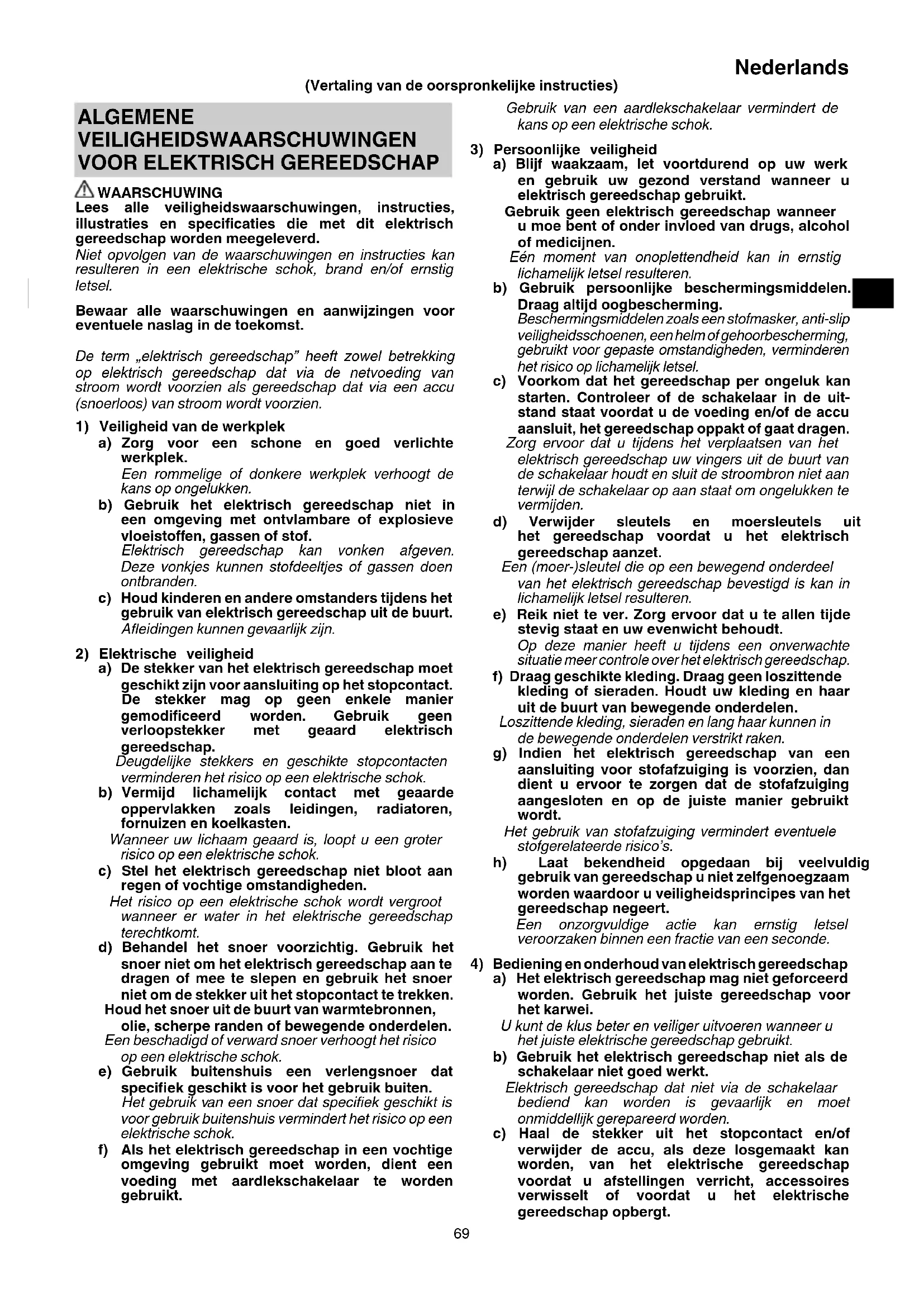 WAARSCHUWING Lees alle veiligheidswaarschuwingen, instructies, illustraties en specifi caties die met dit elektrisch gereedschap worden meegeleverd. Niet opvolgen van de waarschuwingen en instructies kan resulteren in een elektrische schok, brand en/of ernstig letsel. Bewaar alle waarschuwingen en aanwijzingen voor eventuele naslag in de toekomst. De term „elektrisch gereedschap” heeft zowel betrekking op elektrisch gereedschap dat via de netvoeding van stroom wordt voorzien als gereedschap dat via een accu (snoerloos) van stroom wordt voorzien.