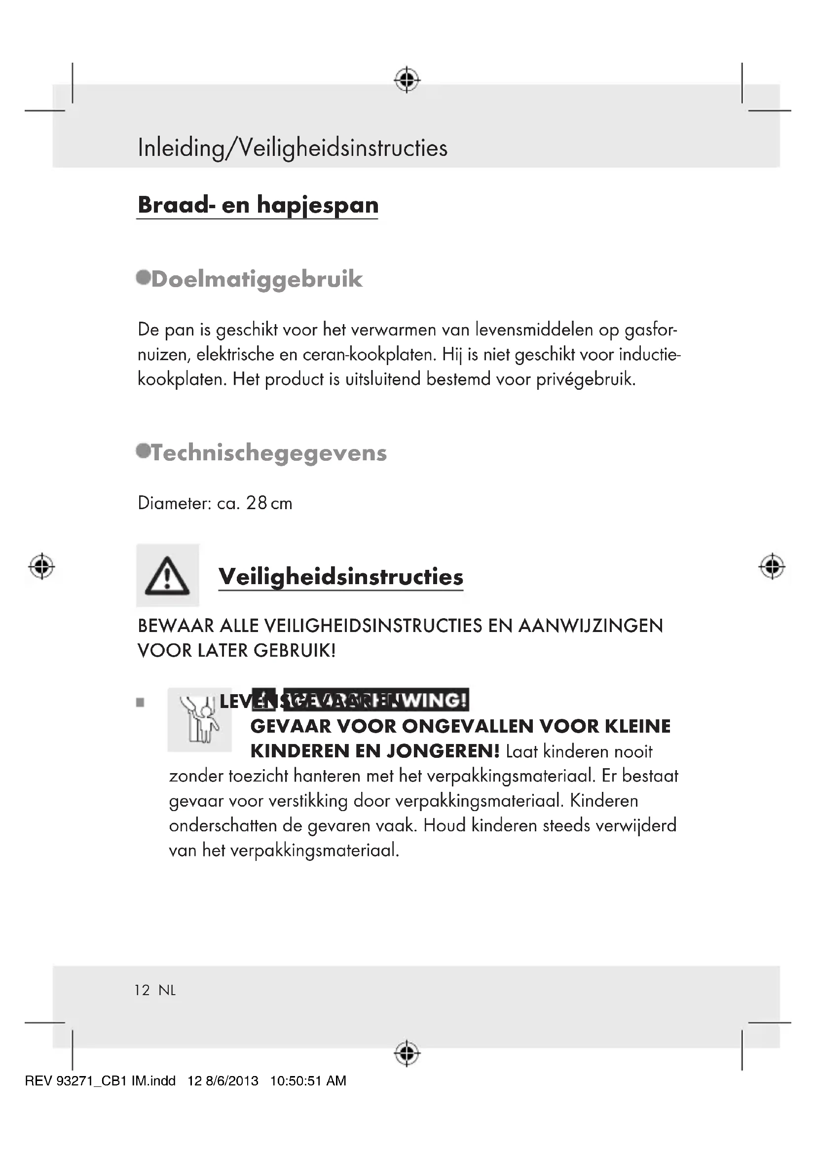 KINDEREN EN JONGEREN! Laat kinderen nooit zonder toezicht hanteren met het verpakkingsmateriaal. Er bestaat gevaar voor verstikking door verpakkingsmateriaal. Kinderen onderschatten de gevaren vaak. Houd kinderen steeds verwijderd van het verpakkingsmateriaal. REV 93271_CB1 IM.indd 12 8/6/2013 10:50:51 AM13 NL Veiligheidsinstructies LETSELGEVAAR! Denk eraan dat de handgrepen bij het koken heet kunnen worden. Gebruik daarom altijd pannenlappen of ovenhandschoenen als bescherming. Gebruik het deksel niet als de greep los zit. Gebruik de pan in geen geval als de handgrepen los zitten. Draai zo nodig de schroefverbinding van de handgrepen vast.