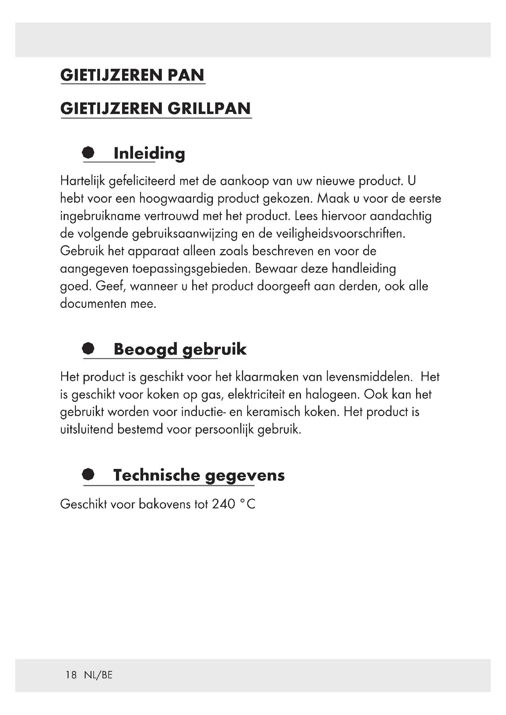 ATTENTION ! Veuillez noter que l'émail peut être endommagé lors d'une chute ou d'un choc. § Recyclage L’emballage se compose de matières recyclables qui peuvent être mises au rebut dans les déchetteries locales. Les possibilités de recyclage des produits usés sont à demander auprès de votre municipalité.18 NL/BE GIETIJZEREN PAN GIETIJZEREN GRILLPAN § Inleiding Hartelijk gefeliciteerd met de aankoop van uw nieuwe product. U hebt voor een hoogwaardig product gekozen. Maak u voor de eerste ingebruikname vertrouwd met het product. Lees hiervoor aandachtig de volgende gebruiksaanwijzing en de veiligheidsvoorschriften. Gebruik het apparaat alleen zoals beschreven en voor de aangegeven toepassingsgebieden. Bewaar deze handleiding goed. Geef, wanneer u het product doorgeeft aan derden, ook alle documenten mee. § Beoogd gebruik Het product is geschikt voor het klaarmaken van levensmiddelen. Het is geschikt voor koken op gas, elektriciteit en halogeen. Ook kan het gebruikt worden voor inductie- en keramisch koken. Het product is uitsluitend bestemd voor persoonlijk gebruik. § Technische gegevens Geschikt voor bakovens tot 240