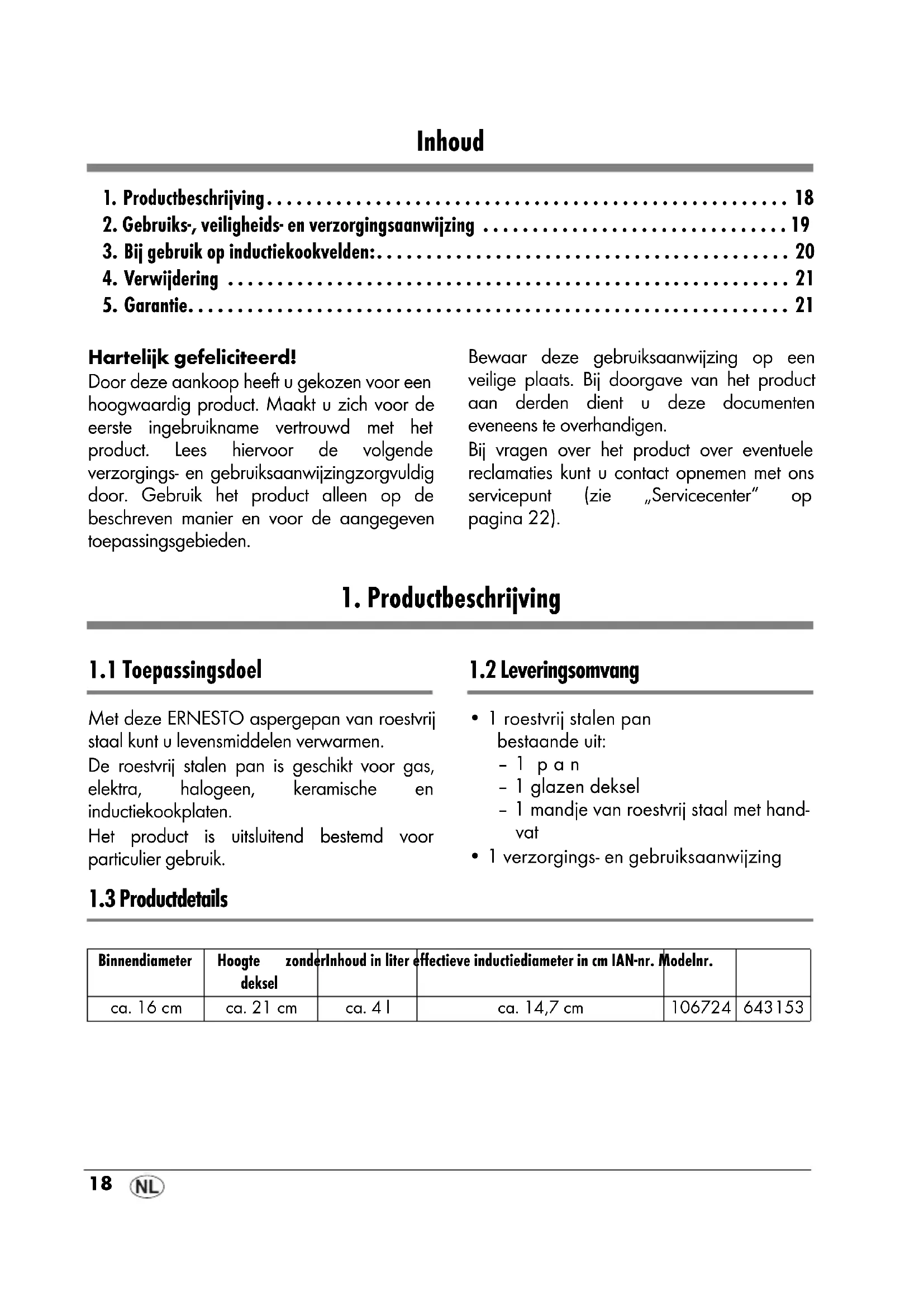 3. Bij gebruik op inductiekookvelden:. . . . . . . . . . . . . . . . . . . . . . . . . . . . . . . . . . . . . . . . . . 20 4. Verwijdering . . . . . . . . . . . . . . . . . . . . . . . . . . . . . . . . . . . . . . . . . . . . . . . . . . . . . . . . . 21 5. Garantie. . . . . . . . . . . . . . . . . . . . . . . . . . . . . . . . . . . . . . . . . . . . . . . . . . . . . . . . . . . . . 21 Hartelijk gefeliciteerd! Door deze aankoop heeft u gekozen voor een hoogwaardig product. Maakt u zich voor de eerste ingebruikname vertrouwd met het product. Lees hiervoor de volgende verzorgings- en gebruiksaanwijzingzorgvuldig door. Gebruik het product alleen op de beschreven manier en voor de aangegeven toepassingsgebieden. Bewaar deze gebruiksaanwijzing op een veilige plaats. Bij doorgave van het product aan derden dient u deze documenten eveneens te overhandigen. Bij vragen over het product over eventuele reclamaties kunt u contact opnemen met ons servicepunt (zie „Servicecenter“ op pagina22).