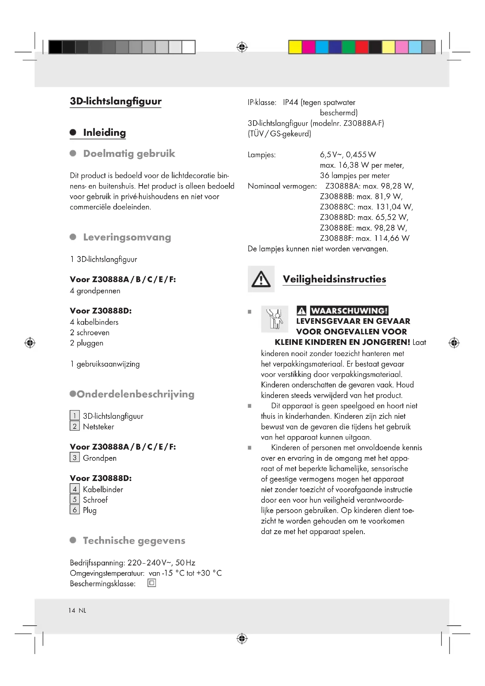 Plug Technische gegevens Bedrijfsspanning: 220–240 V∼, 50 Hz Omgevingstemperatuur: van -15°C tot +30°C Beschermingsklasse: IP-klasse: IP44 (tegen spatwater beschermd) 3D-lichtslangfiguur (modelnr. Z30888A-F) (TÜV / GS-gekeurd) Lampjes: 6,5 V∼, 0,455 W max. 16,38 W per meter, 36 lampjes per meter Nominaal vermogen: Z30888A: max. 98,28 W, Z30888B: max. 81,9 W, Z30888C: max. 131,04 W, Z30888D: max. 65,52 W, Z30888E: max. 98,28 W, Z30888F: max. 114,66 W De lampjes kunnen niet worden vervangen. Veiligheidsinstructies