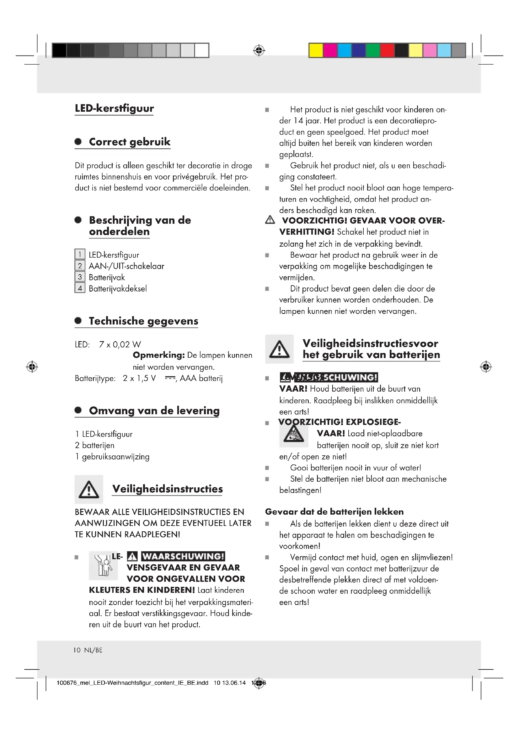 Milieuschade door verkeerde afvoer van batterijen! Batterijen mogen niet via het huisvuil worden weg- gegooid. Ze kunnen giftig zwaar metaal bevatten en vallen onder het chemisch afval. De chemische symbolen van de zware metalen zijn als volgt: Cd = cadmium, Hg = kwik, Pb = lood. Geef verbruikte batterijen daarom af bij een gemeentelijk inzamel- punt. Garantie Het apparaat wordt volgens strenge kwaliteitsricht- lijnen zorgvuldig geproduceerd en voor levering grondig getest. In geval van schade aan het product kunt u rechtmatig beroep doen op de verkoper van het product. Deze wettelijke rechten worden door onze hierna vermelde garantie niet beperkt. 100676_mel_LED-Weihnachtsfigur_content_IE_BE.indd 11 13.06.14 12:0612 NL/BE U ontvangt op dit apparaat 3 jaar garantie vanaf de aankoopdatum. De garantieperiode start op de dag van aankoop. Bewaar de originele kassabon alstublieft. Dit document is nodig als bewijs voor aankoop. Wanneer binnen 3 jaar na de aankoopdatum van dit product een materiaal- of productiefout optreedt, dan wordt het product door ons – naar onze keu- ze – gratis voor u gerepareerd of vervangen. Deze garantie komt te vervallen als het product bescha- digd wordt, niet correct gebruikt of onderhouden wordt. De garantie geldt voor materiaal- en productiefoute