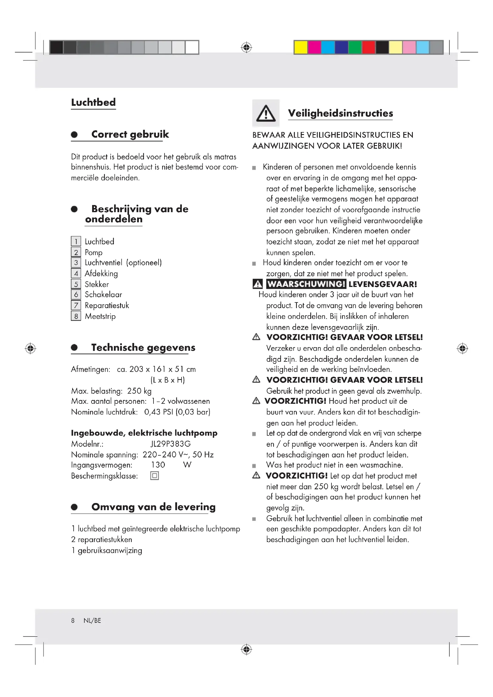 Meetstrip Technische gegevens Afmetingen: ca. 203 x 161 x 51 cm (L x B x H) Max. belasting: 250 kg Max. aantal personen: 1–2 volwassenen Nominale luchtdruk: 0,43 PSI (0,03 bar) Ingebouwde, elektrische luchtpomp Modelnr.: JL29P383G Nominale spanning: 220–240 V∼, 50 Hz Ingangsvermogen: 130 W Beschermingsklasse: Omvang van de levering 1 luchtbed met geïntegreerde elektrische luchtpomp 2 reparatiestukken 1 gebruiksaanwijzing Veiligheidsinstructies