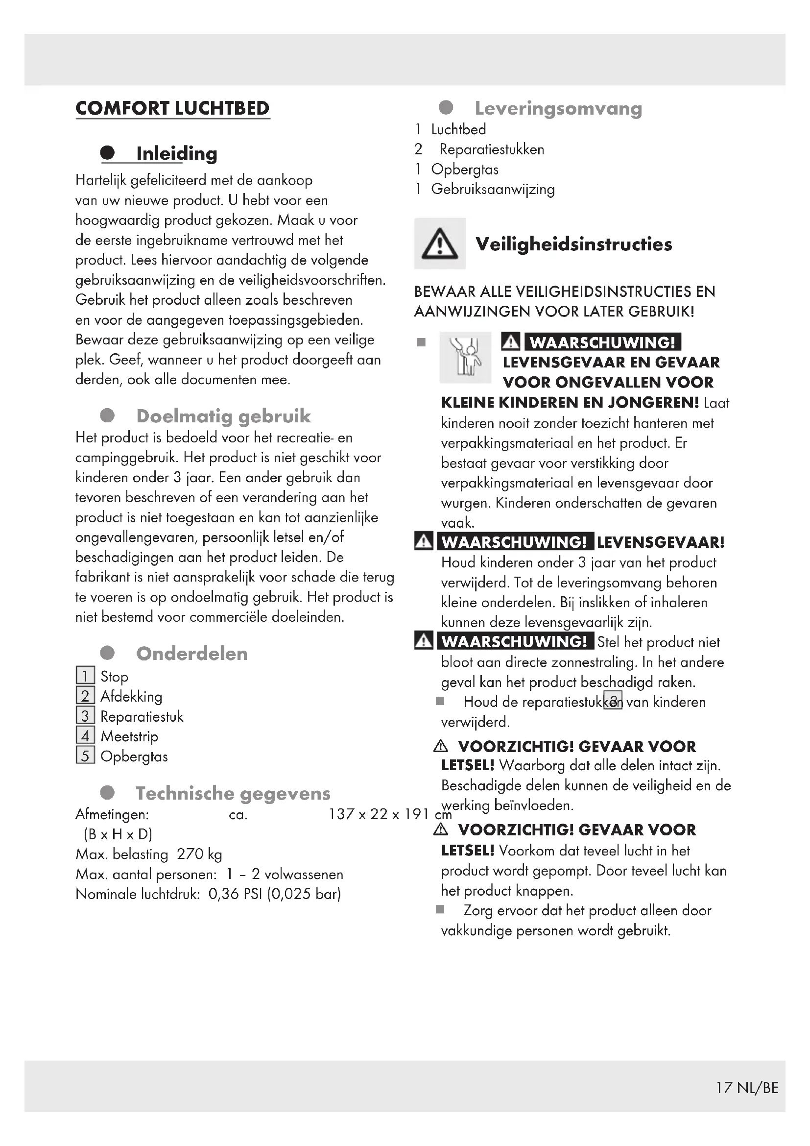 Opbergtas Technische gegevens Afmetingen: ca. 137 x 22 x 191 cm (B x H x D) Max. belasting 270 kg Max. aantal personen: 1 – 2 volwassenen Nominale luchtdruk: 0,36 PSI (0,025 bar) Leveringsomvang 1 Luchtbed 2 Reparatiestukken 1 Opbergtas 1 Gebruiksaanwijzing Veiligheidsinstructies