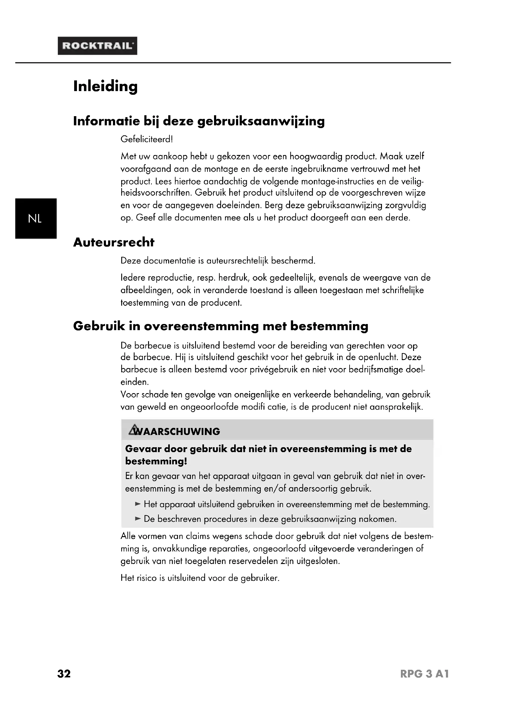 Inleiding Informatie bij deze gebruiksaanwijzing Gefeliciteerd! Met uw aankoop hebt u gekozen voor een hoogwaardig product. Maak uzelf voorafgaand aan de montage en de eerste ingebruikname vertrouwd met het product. Lees hiertoe aandachtig de volgende montage-instructies en de veilig- heidsvoorschriften. Gebruik het product uitsluitend op de voorgeschreven wijze en voor de aangegeven doeleinden. Berg deze gebruiksaanwijzing zorgvuldig op. Geef alle documenten mee als u het product doorgeeft aan een derde. Auteursrecht Deze documentatie is auteursrechtelijk beschermd. Iedere reproductie, resp. herdruk, ook gedeeltelijk, evenals de weergave van de afbeeldingen, ook in veranderde toestand is alleen toegestaan met schriftelijke toestemming van de producent. Gebruik in overeenstemming met bestemming De barbecue is uitsluitend bestemd voor de bereiding van gerechten voor op de barbecue. Hij is uitsluitend geschikt voor het gebruik in de openlucht. Deze barbecue is alleen bestemd voor privégebruik en niet voor bedrijfsmatige doel- einden. Voor schade ten gevolge van oneigenlijke en verkeerde behandeling, van gebruik van geweld en ongeoorloofde modifi catie, is de producent niet aansprakelijk. WAARSCHUWING Gevaar door gebruik dat niet in overeenstemming is met de bestemming! Er kan gevaar van het apparaat uitgaan in geval van gebruik dat niet in over- eenstemming is met de bestemming en/of andersoortig gebruik. ► Het apparaat uitsluitend gebruiken in overeenstemming met de bestemming. ► De beschreven procedures in deze gebruiksaanwijzing nakomen. Alle vormen van claims wegens schade door gebruik dat niet volgens de bestem- ming is, onvakkundige reparaties, ongeoorloofd uitgevoerde veranderingen of gebruik van niet toegelaten reservedelen zijn uitgesloten. Het risico is uitsluitend voor de gebruiker. IB_79827_RPG3A1_LB1.indb 32IB_79827_RPG3A1_LB1.indb 32 10.12.12 14:5610.12.12 14:5633 RPG 3 A1