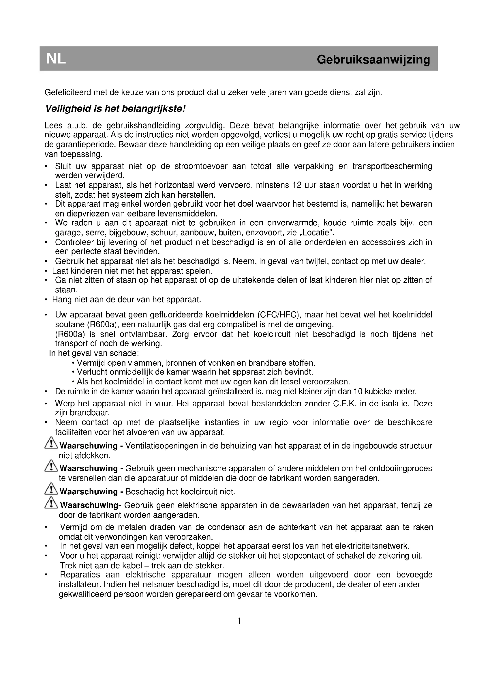 - Uw apparaat bevat geen gefluorideerde koelmiddelen (CFC/HFC), maar het bevat wel het koelmiddel soutane (R600a), een natuurlijk gas dat erg compatibel is met de omgeving. (R600a) is snel ontvlambaar. Zorg ervoor dat het koelcircuit niet beschadigd is noch tijdens het transport of noch de werking. In het geval van schade;