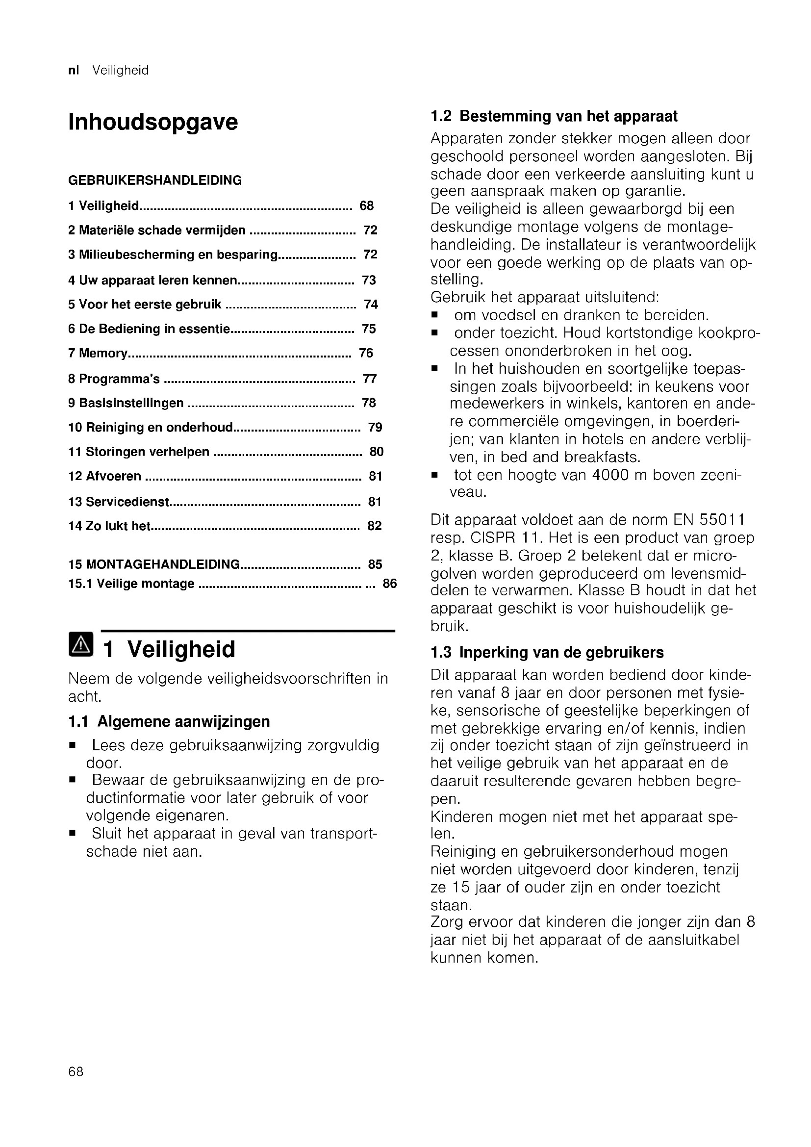 1 Veiligheid Neem de volgende veiligheidsvoorschriften in acht. 1.1 Algemene aanwijzingen ¡ Lees deze gebruiksaanwijzing zorgvuldig door. ¡ Bewaar de gebruiksaanwijzing en de pro- ductinformatie voor later gebruik of voor volgende eigenaren. ¡ Sluit het apparaat in geval van transport- schade niet aan. 1.2 Bestemming van het apparaat Apparaten zonder stekker mogen alleen door geschoold personeel worden aangesloten. Bij schade door een verkeerde aansluiting kunt u geen aanspraak maken op garantie. De veiligheid is alleen gewaarborgd bij een deskundige montage volgens de montage- handleiding. De installateur is verantwoordelijk voor een goede werking op de plaats van op- stelling. Gebruik het apparaat uitsluitend: ¡ om voedsel en dranken te bereiden. ¡ onder toezicht. Houd kortstondige kookpro- cessen ononderbroken in het oog. ¡ In het huishouden en soortgelijke toepas- singen zoals bijvoorbeeld: in keukens voor medewerkers in winkels, kantoren en ande- re commerciële omgevingen, in boerderi- jen; van klanten in hotels en andere verblij- ven, in bed and breakfasts. ¡ tot een hoogte van 4000m boven zeeni- veau. Dit apparaat voldoet aan de norm EN55011 resp. CISPR11. Het is een product van groep 2, klasse B. Groep 2 betekent dat er micro- golven worden geproduceerd om levensmid- delen te verwarmen. Klasse B houdt in dat het apparaat geschikt is voor huishoudelijk ge- bruik. 1.3 Inperking van de gebruikers Dit apparaat kan worden bediend door kinde- ren vanaf 8 jaar en door personen met fysie- ke, sensorische of geestelijke beperkingen of met gebrekkige ervaring en/of kennis, indien zij onder toezicht staan of zijn geïnstrueerd in het veilige gebruik van het apparaat en de daaruit resulterende gevaren hebben begre- pen. Kinderen mogen niet met het apparaat spe- len. Reiniging en gebruikersonderhoud mogen niet worden uitgevoerd door kinderen, tenzij ze 15jaar of ouder zijn en onder toezicht staan. Zorg ervoor dat kinderen die jonger zijn dan 8 jaar niet bij het apparaat of de aansluitkabel kunnen komen.Veiligheid nl