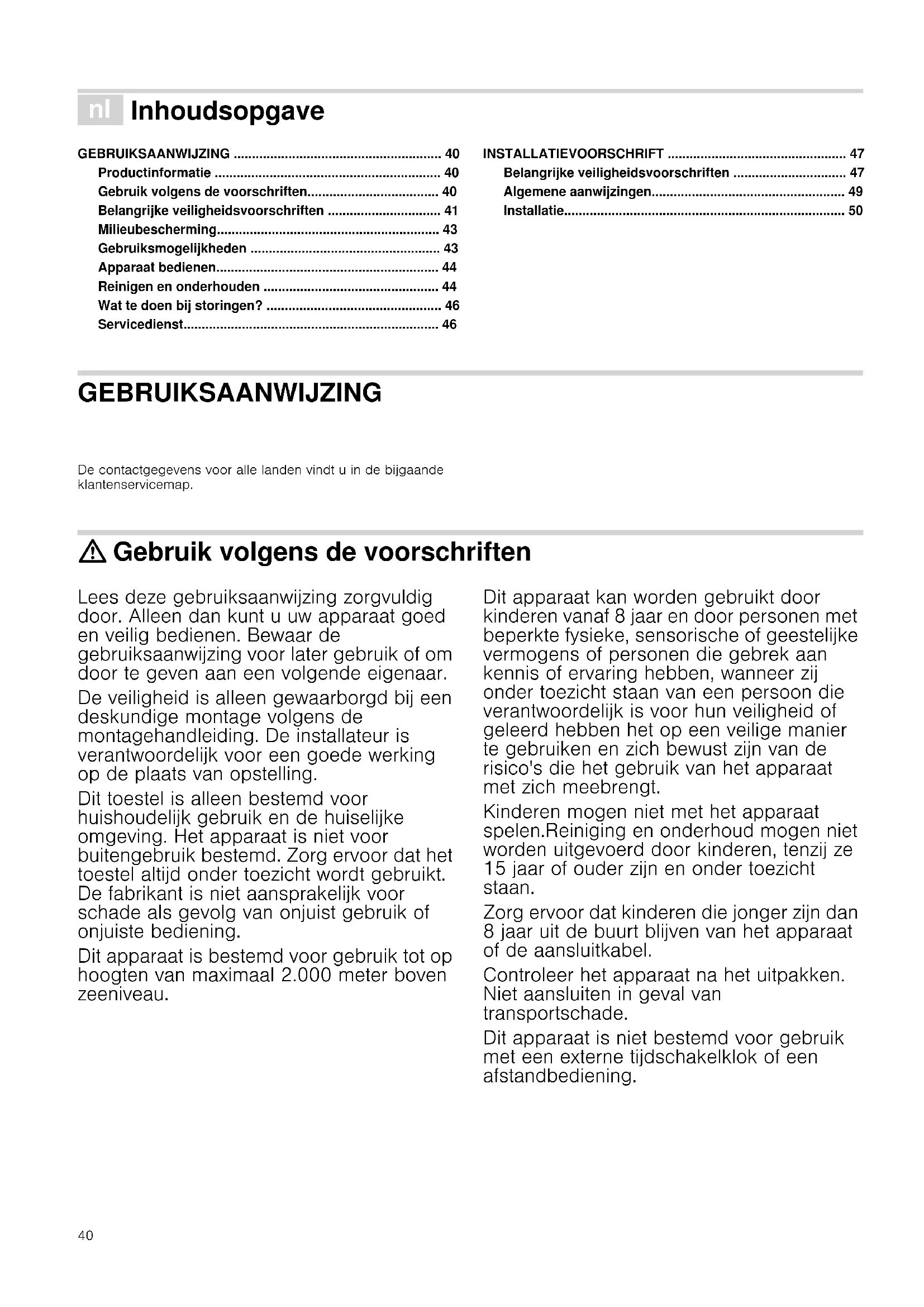 - &40 é Inhoudsopgave [nl ]Gebr ui ksaanwijzing en i ns t al l at i ev oor s chr i f t GEBRUIKSAANWIJZING p. 40