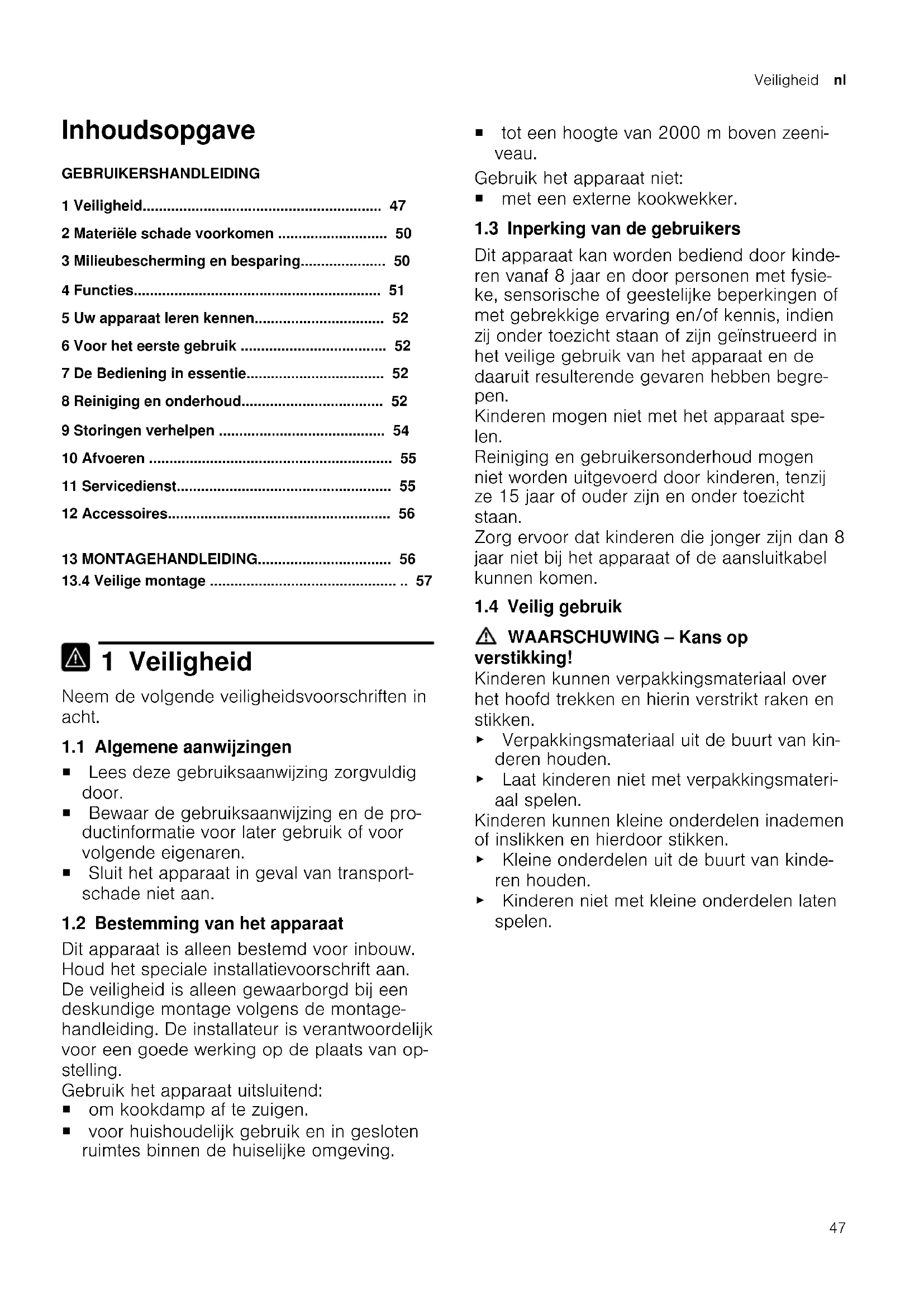 1 Veiligheid Neem de volgende veiligheidsvoorschriften in acht. 1.1 Algemene aanwijzingen ¡ Lees deze gebruiksaanwijzing zorgvuldig door. ¡ Bewaar de gebruiksaanwijzing en de pro- ductinformatie voor later gebruik of voor volgende eigenaren. ¡ Sluit het apparaat in geval van transport- schade niet aan. 1.2 Bestemming van het apparaat Dit apparaat is alleen bestemd voor inbouw. Houd het speciale installatievoorschrift aan. De veiligheid is alleen gewaarborgd bij een deskundige montage volgens de montage- handleiding. De installateur is verantwoordelijk voor een goede werking op de plaats van op- stelling. Gebruik het apparaat uitsluitend: ¡ om kookdamp af te zuigen. ¡ voor huishoudelijk gebruik en in gesloten ruimtes binnen de huiselijke omgeving. ¡ tot een hoogte van 2000m boven zeeni- veau. Gebruik het apparaat niet: ¡ met een externe kookwekker. 1.3 Inperking van de gebruikers Dit apparaat kan worden bediend door kinde- ren vanaf 8 jaar en door personen met fysie- ke, sensorische of geestelijke beperkingen of met gebrekkige ervaring en/of kennis, indien zij onder toezicht staan of zijn geïnstrueerd in het veilige gebruik van het apparaat en de daaruit resulterende gevaren hebben begre- pen. Kinderen mogen niet met het apparaat spe- len. Reiniging en gebruikersonderhoud mogen niet worden uitgevoerd door kinderen, tenzij ze 15jaar of ouder zijn en onder toezicht staan. Zorg ervoor dat kinderen die jonger zijn dan 8 jaar niet bij het apparaat of de aansluitkabel kunnen komen. 1.4 Veilig gebruik WAARSCHUWING‒Kans op verstikking! Kinderen kunnen verpakkingsmateriaal over het hoofd trekken en hierin verstrikt raken en stikken. ▶ Verpakkingsmateriaal uit de buurt van kin- deren houden. ▶ Laat kinderen niet met verpakkingsmateri- aal spelen. Kinderen kunnen kleine onderdelen inademen of inslikken en hierdoor stikken. ▶ Kleine onderdelen uit de buurt van kinde- ren houden. ▶ Kinderen niet met kleine onderdelen laten spelen.nl Veiligheid