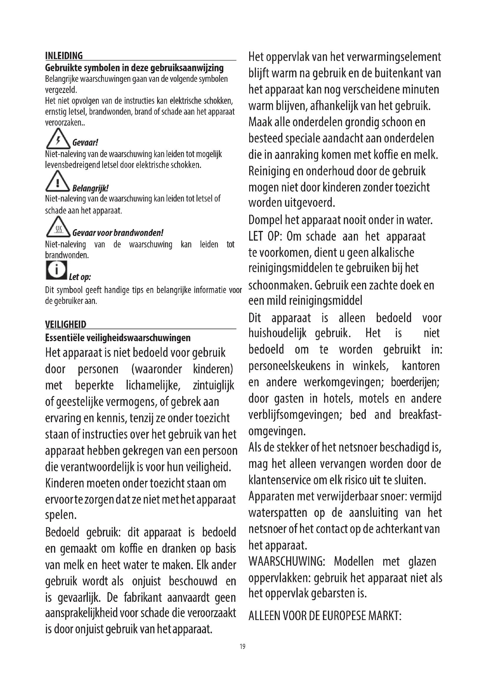 Das Material der Platte muss für das Gewicht der Maschine von ca. 25 kg geeignet sein. DE19 INLEIDING Gebruikte symbolen in deze gebruiksaanwijzing Belangrijke waarschuwingen gaan van de volgende symbolen vergezeld. Het niet opvolgen van de instructies kan elektrische schokken, ernstig letsel, brandwonden, brand of schade aan het apparaat veroorzaken.. Gevaar! Niet-naleving van de waarschuwing kan leiden tot mogelijk levensbedreigend letsel door elektrische schokken. Belangrijk! Niet-naleving van de waarschuwing kan leiden tot letsel of schade aan het apparaat. Geva ar voor brandwonden! Niet-naleving van de waarschuwing kan leiden tot brandwonden. Let op: Dit symbool geeft handige tips en belangrijke informatie voor de gebruiker aan. VEILIGHEID Essentiële veiligheidswaarschuwingen Het apparaat is niet bedoeld voor gebruik door personen (waaronder kinderen) met beperkte lichamelijke, zintuiglijk of geestelijke vermogens, of gebrek aan ervaring en kennis, tenzij ze onder toezicht staan of instructies over het gebruik van het apparaat hebben gekregen van een persoon die verantwoordelijk is voor hun veiligheid. Kinderen moeten onder toezicht staan om ervoor te zorgen dat ze niet met het apparaat spelen. Bedoeld gebruik: dit apparaat is bedoeld en gemaakt om koffie en dranken op basis van melk en heet water te maken. Elk ander gebruik wordt als onjuist beschouwd en is gevaarlijk. De fabrikant aanvaardt geen aansprakelijkheid voor schade die veroorzaakt is door onjuist gebruik van het apparaat. Het oppervlak van het verwarmingselement blijft warm na gebruik en de buitenkant van het apparaat kan nog verscheidene minuten warm blijven, afhankelijk van het gebruik. Maak alle onderdelen grondig schoon en besteed speciale aandacht aan onderdelen die in aanraking komen met koffie en melk. Reiniging en onderhoud door de gebruik mogen niet door kinderen zonder toezicht worden uitgevoerd. Dompel het apparaat nooit onder in water. LET OP: Om schade aan het apparaat te voorkomen, dient u geen alkalische reinigingsmiddelen te gebruiken bij het schoonmaken. Gebruik een zachte doek en een mild reinigingsmiddel Dit apparaat is alleen bedoeld voor huishoudelijk gebruik. Het is niet bedoeld om te worden gebruikt in: personeelskeukens in winkels, kantoren en andere werkomgevingen; boerderijen; door gasten in hotels, motels en andere verblijfsomgevingen; bed and breakfast- omgevingen. Als de stekker of het netsnoer beschadigd is, mag het alleen vervangen worden door de klantenservice om elk risico uit te sluiten. Apparaten met verwijderbaar snoer: vermijd waterspatten op de aansluiting van het netsnoer of het contact op de achterkant van het apparaat. WAARSCHUWING: Modellen met glazen oppervlakken: gebruik het apparaat niet als het oppervlak gebarsten is.