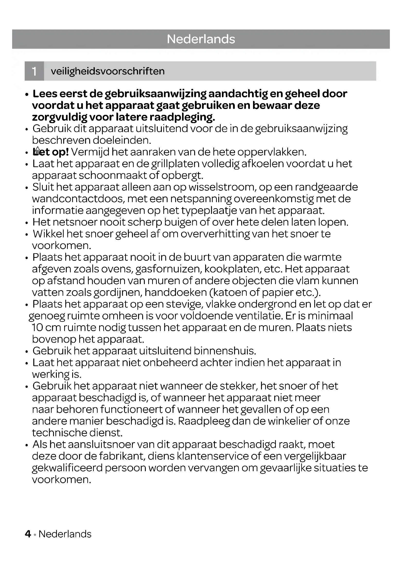- Als de contactgrill klaar is, smeert u de grillplaten in met een beetje olijfolie. Plaats de panini op de onderste grillplaat en sluit het deksel. Grill de panini gedurende 3 tot 4 minuten of totdat deze bruin is. Panini met geitenkaas Voor een panini heeft u nodig: 1 panini broodje of pistolet 2 eetlepels groene pesto 2 plakken geitenkaas (Hollands) 1 courgette 1 bosuitje in ringetjes een paar zwarte olijven in dunne plakjes Schaaf met een kaasschaaf in de lengte drie dunne plakken van de courgette. Snijd de korsten van de plakken kaas. Snijd de panini in de lengte open en bestrijk de twee helften met pesto. Beleg een helft met een plak courgette en een plak kaas, verdeel hierover de helft van de uienringetjes en olijven. Leg hierop weer een plak courgette en de tweede plak kaas. Verdeel de rest van de bosui en olijven erover en leg hierop de laatste plak courgette en de andere helft van panini. Plaats de panini op de onderste grillplaat en sluit het deksel. Rooster de panini goudbruin. Probeer ook eens de volgende panini’s: - Achterham, jong belegen kaas, basilicumpesto en bosui. - Gerookte zalm, geitenkaas, tomaten, bosui, verse basilicum, groene pesto en peper en zout naar smaak. - Kip, ananas, paprika of kerrie. - Tonijn, tomaat, ui en jonge kaas. - Prosciutto ham, zongedroogde tomaat, mozzarella, kruidenkaas en rucola. Nederlands • 9• Carefully and fully read the instruction manual prior to using the appliance and carefully store the manual for future reference.