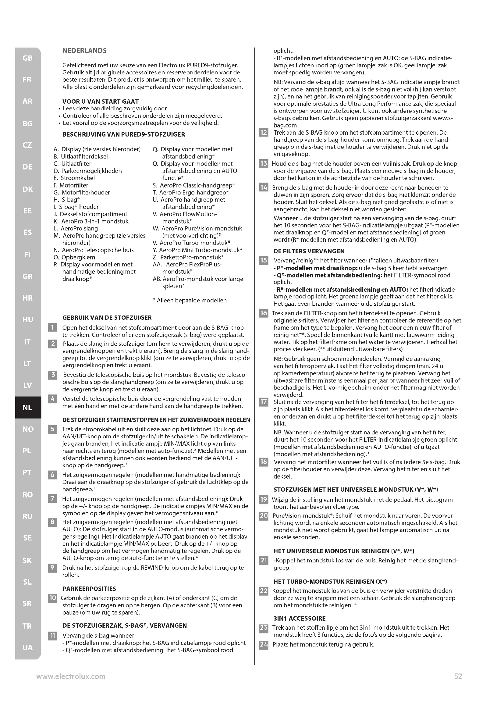 UANEDERLANDS Gefeliciteerd met uw keuze van een Electrolux PURED9-stofzuiger. Gebruik altijd originele accessoires en reserveonderdelen voor de beste resultaten. Dit product is ontworpen om het milieu te sparen. Alle plastic onderdelen zijn gemarkeerd voor recyclingdoeleinden.
