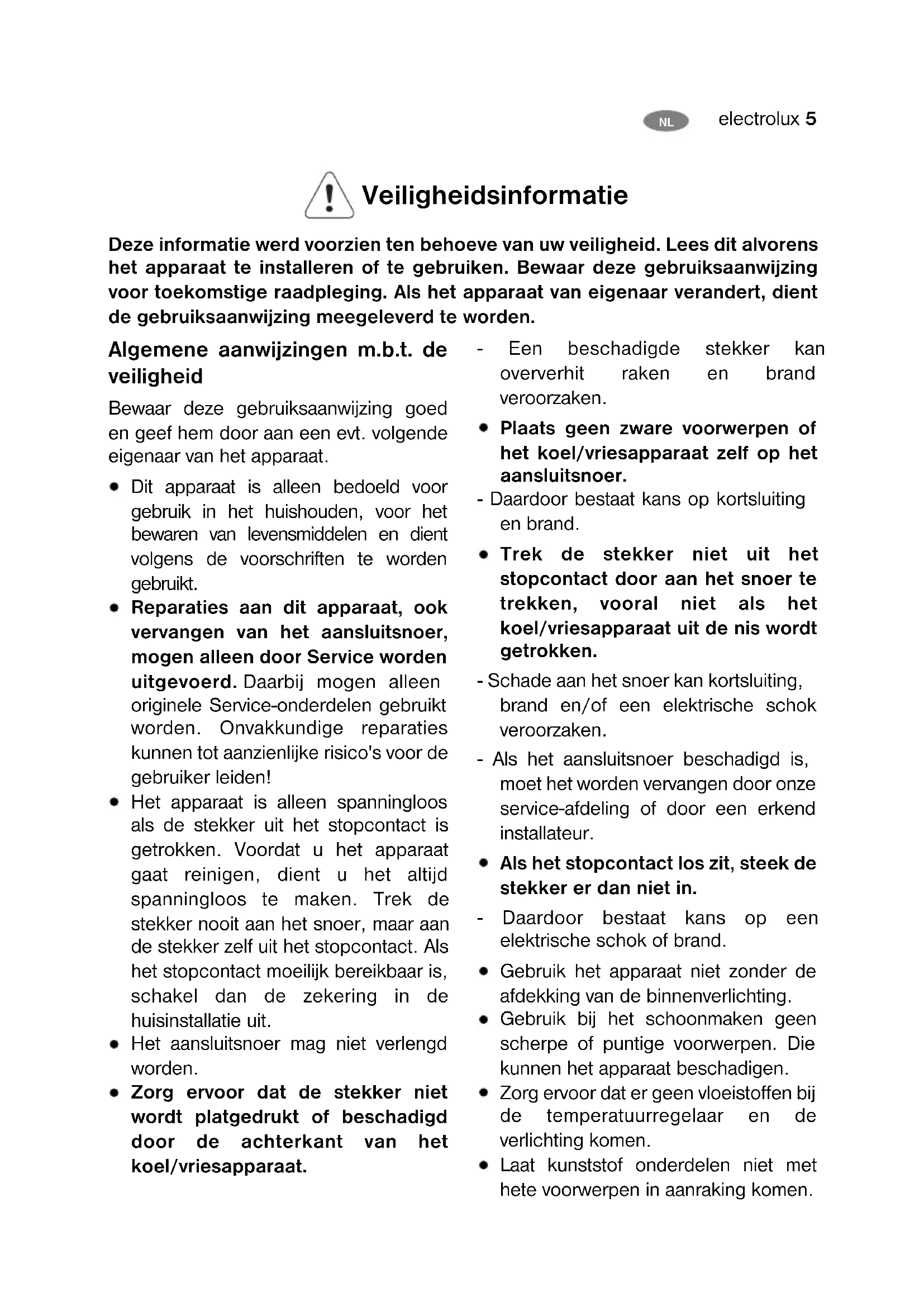 - Een beschadigde stekker kan oververhit raken en brand veroorzaken. Plaats geen zware voorwerpen of het koel/vriesapparaat zelf op het aansluitsnoer. - Daardoor bestaat kans op kortsluiting en brand. Trek de stekker niet uit het stopcontact door aan het snoer te trekken, vooral niet als het koel/vriesapparaat uit de nis wordt getrokken. - Schade aan het snoer kan kortsluiting, brand en/of een elektrische schok veroorzaken. - Als het aansluitsnoer beschadigd is, moet het worden vervangen door onze service-afdeling of door een erkend installateur. Als het stopcontact los zit, steek de stekker er dan niet in. - Daardoor bestaat kans op een elektrische schok of brand. Gebruik het apparaat niet zonder de afdekking van de binnenverlichting. Gebruik bij het schoonmaken geen scherpe of puntige voorwerpen. Die kunnen het apparaat beschadigen. Zorg ervoor dat er geen vloeistoffen bij de temperatuurregelaar en de verlichting komen. Laat kunststof onderdelen niet met hete voorwerpen in aanraking komen. Algemene aanwijzingen m.b.t. de veiligheid Bewaar deze gebruiksaanwijzing goed en geef hem door aan een evt. volgende eigenaar van het apparaat. Dit apparaat is alleen bedoeld voor gebruik in het huishouden, voor het bewaren van levensmiddelen en dient volgens de voorschriften te worden gebruikt. Reparaties aan dit apparaat, ook vervangen van het aansluitsnoer, mogen alleen door Service worden uitgevoerd. Daarbij mogen alleen originele Service-onderdelen gebruikt worden. Onvakkundige reparaties kunnen tot aanzienlijke risico's voor de gebruiker leiden! Het apparaat is alleen spanningloos als de stekker uit het stopcontact is getrokken. Voordat u het apparaat gaat reinigen, dient u het altijd spanningloos te maken. Trek de stekker nooit aan het snoer, maar aan de stekker zelf uit het stopcontact. Als het stopcontact moeilijk bereikbaar is, schakel dan de zekering in de huisinstallatie uit. Het aansluitsnoer mag niet verlengd worden. Zorg ervoor dat de stekker niet wordt platgedrukt of beschadigd door de achterkant van het koel/vriesapparaat. Veiligheidsinformatie Deze informatie werd voorzien ten behoeve van uw veiligheid. Lees dit alvorens het apparaat te installeren of te gebruiken. Bewaar deze gebruiksaanwijzing voor toekomstige raadpleging. Als het apparaat van eigenaar verandert, dient de gebruiksaanwijzing meegeleverd te worden.6 electrolux