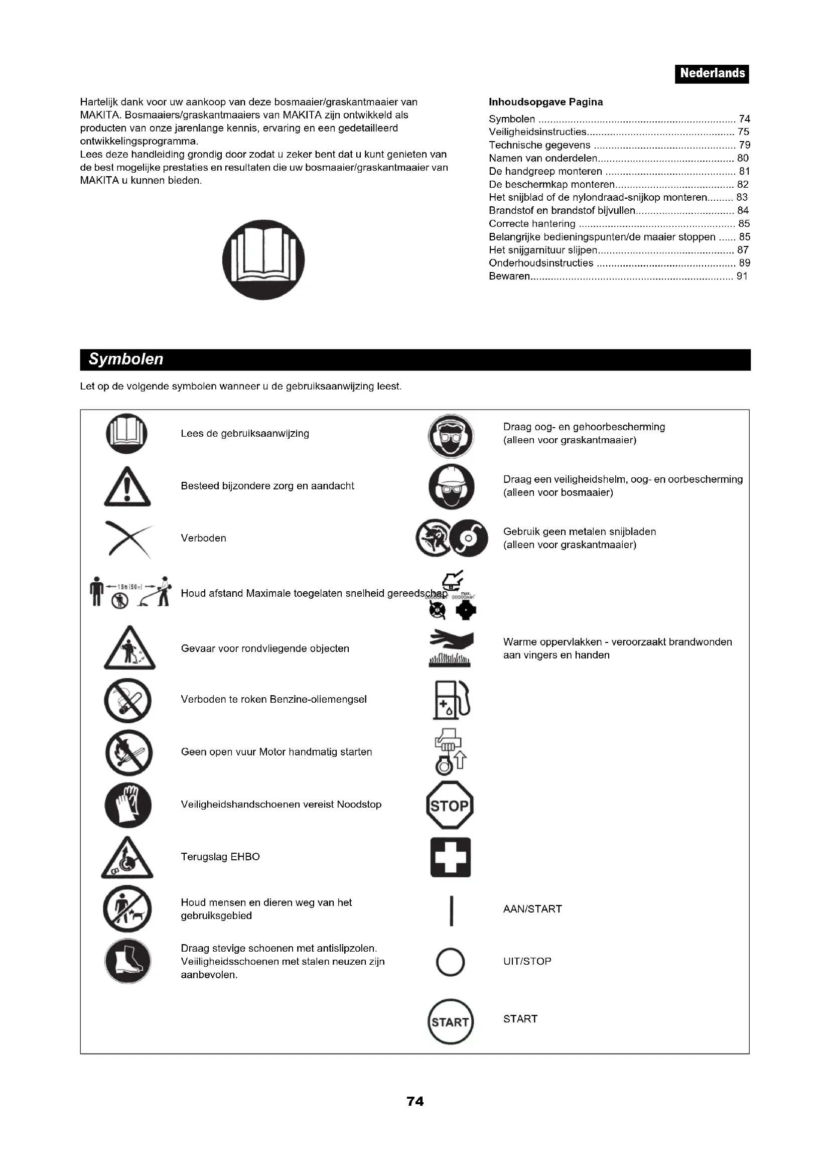 – Gebruik de bosmaaier/graskantmaaier met zo weinig mogelijk lawaai en vervuiling. Controleer vooral of de carburateur correct is afgesteld. – Maak de bosmaaier/graskantmaaier regelmatig schoon en controleer of alle schroeven en moeren stevig zijn vastgemaakt. – Onderhoud of bewaar de bosmaaier/graskantmaaier niet in de buurt van open vuur. – Bewaar de bosmaaier/graskantmaaier altijd in een afgesloten ruimte en met een leeggemaakte brandstoftank. – Wanneer u het gereedschap reinigt, onderhoudt of opbergt, bevestigt u altijd de beschermkap op het snijblad. Volg de relevante instructies voor het voorkomen van ongevallen die door de relevante beroepsverenigingen en verzekeringsmaatschappijen zijn uitgevaardigd. Breng geen wijzigingen aan de bosmaaier/graskantmaaier aan, omdat u op die manier uw veiligheid in gevaar brengt. Het uitvoeren van onderhoud of reparaties door de gebruiker is beperkt tot de activiteiten die in de gebruiksaanwijzing zijn beschreven. Alle andere werkzaamheden moet worden uitgevoerd door een erkend servicecentrum. Gebruik alleen originele reserveonderdelen en accessoires die zijn vervaardigd en geleverd door MAKITA. Als u niet-goedgekeurde accessoires en gereedschappen gebruikt, zal het risico op ongevallen toenemen. MAKITA aanvaardt geen enkele aansprakelijkheid voor ongevallen of schade, veroorzaakt door het gebruik van niet-goedgekeurde snijgarnituren, bevestigingsmiddelen voor snijgarnituren of accessoires. EHBO Zorg dat er altijd een EHBO-doos beschikbaar is in de buurt waar er wordt gemaaid om eerste hulp te bieden bij eventuele ongevallen. Vervang onmiddellijk elk item dat uit de EHBO-doos is genomen. Geef de volgende informatie wanneer u hulp inroept: – Plaats van het ongeval – Beschrijving van het ongeval – Aantal gewonden – Soort letsels – Uw naam Trillingen – Personen met een slechte bloedsomloop die worden blootgesteld aan sterke trillingen, kunnen verwondingen aan bloedvaten of het zenuwstelsel oplopen. Trillingen kunnen de volgende symptomen veroorzaken in de vingers, handen of polsen: “slapen” (ongevoeligheid), tintellingen, pijn, stekend gevoel, veranderen van huidskleur of van de huid. Als een van deze symptomen zich voordoet, raadpleegt u uw huisarts! – Om de kans op deze “witte-vingerziekte” te verkleinen, houdt u uw handen warm tijdens het werk en onderhoudt u het gereedschap en de accessoires goed. Alleen voor Europese landen EU-verklaring van conformiteit Wij, Makita Corporation, als de verantwoordelijke fabrikant, verklaren dat de volgende Makita-machine(s): Aanduiding van de machine: Bosmaaier/Graskantmaaier Modelnr./Type: EM2600U, EM2600L Technische gegevens: zie de tabel “TECHNISCHE GEGEVENS” in serie zijn geproduceerd en Voldoen aan de volgende Europese richtlijnen: 2000/14/EC en 2006/42/EC, 2004/108/EC En zijn gefabriceerd in overeenstemming met de volgende normen of genormaliseerd documenten: