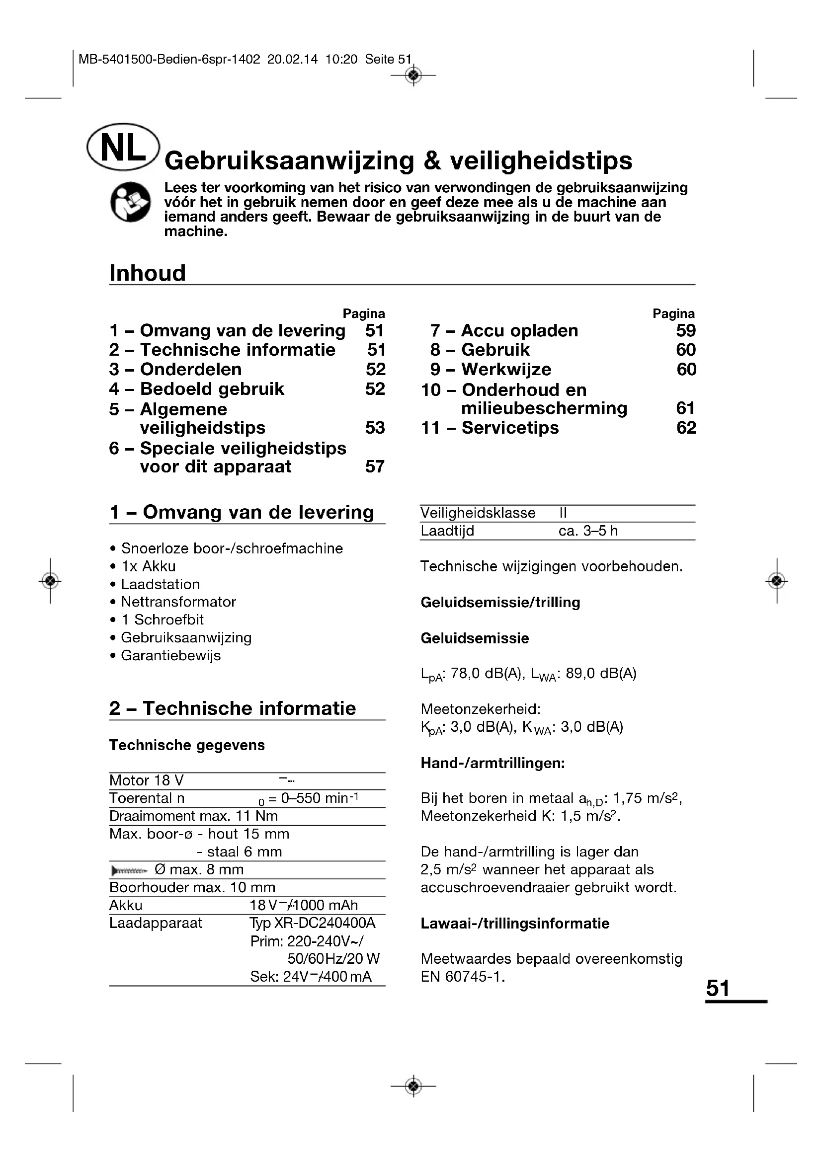 - Snoerloze boor-/schroefmachine• 1x Akku• Laadstation• Nettransformator• 1 Schroefbit• Gebruiksaanwijzing• Garantiebewijs 2 – Technische informatie Technische gegevensMotor 18 V–...Toerental n = 0–550 min Draaimoment max. 11 NmMax. boor-ø - hout 15 mm- staal 6 mmØ max. 8 mmBoorhouder max. 10 mmAkku 18 V–.../1000 mAh Laadapparaat Typ XR-DC240400A Prim: 220-240V~/50/60Hz/20 WSek: 24V–.../400mAVeiligheidsklasse IILaadtijd ca. 3–5 hTechnische wijzigingen voorbehouden.Geluidsemissie/trillingGeluidsemissie