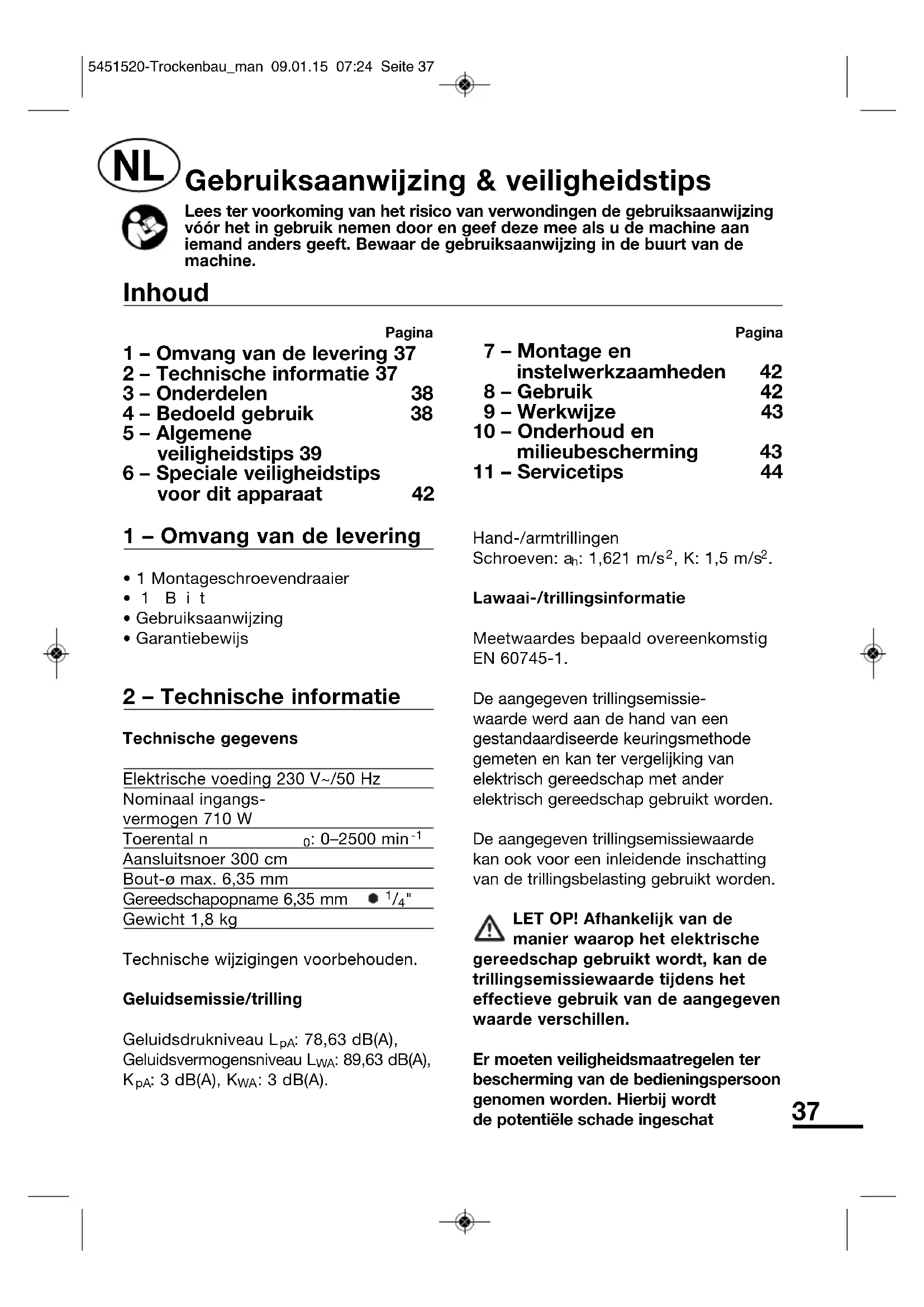 5451520-Trockenbau_man 09.01.15 07:24 Seite 37rekening houdend met de effectieve gebruiksomstandigheden. (Daarbij dient met alle fasen van de bedrijfscyclus rekening gehouden te worden, d.w.z. ook tijdspannen, tijdens welke het elektrische gereedschap uitgeschakeld is en tijdspannen, tijdens welke het weliswaar ingeschakeld is, maar zonder belasting in werking is.) LET OP! Een zekere geluidshinder door dit apparaat is onvermijdbaar. Stel lawaai producerende werkzaamheden dan ook uit tot toelaatbare en daarvoor bepaalde tijdstippen. Houd u eventueel aan rusttijden en beperk de arbeidsduur tot het noodzakelijkste. LET OP! Lawaai kan gehoorschade veroorzaken. Daarom uitsluitend met een geschikte gehoorbescherming werken. Personen die zich in de omgeving bevinden, dienen daarom eveneens een geschikte gehoor - bescherming te dragen. 3 – Onderdelen 1 Riemhouder 2 Grendelinrichting voor continue werking 3 Schakelaar “Aan/uit” 4 Toerentalregelaar 5 Schakelaar “Draaiing naar rechts/ draaiing naar links” 6 Bit-/gereedschapsopname 7 Dieptebegrenzer 8 Instelring 4 – Bedoeld gebruik Verwerking van zelfborende en schroefdraadvormende schroeven bij serieschroefverbindingen bij de bouw van gevels, wanden en daken. Gebruik machine en toebehoren uitsluitend voor hun doelmatig toepassingsgebied. Alle andere toepassingen worden uitdrukkelijk uitgesloten. Dit apparaat is alleen voor gebruik in huishoudelijke toepassingen bestemd. Niet-reglementair gebruik Alle toepassingen met het apparaat die niet in het hoofdstuk 'Reglementair gebruik' vermeld worden, gelden als niet-reglementair gebruik. Toepassingen waarvoor het elektro - gereedschap niet voorzien is, kunnen gevaarlijke situaties en letsels veroorzaken. Gebruik geen toebehoren die niet speciaal voor dit elektrogereedschap voorzien zijn. Er bestaat verwondingsgevaar. Voor alle daaruit voortvloeiende zaakschade zoals persoonlijke schade die het gevolg is van verkeerd gebruik is alleen de gebruiker van het apparaat aansprakelijk. Bij gebruik van andere resp. niet- originele onderdelen aan de machine vervalt de garantie van de fabrikant. Restrisico's: De gebruiksaanwijzing bij dit elektrogereedschap bevat uitgebreide instructies om veilig te werken. Toch draagt ieder elektrogereedschap bepaalde restrisico's in zich, die ook door de aanwezige veiligheids - voorzieningen niet volledig uitgesloten kunnen worden. Bedien elektro - gereedschap daarom altijd met de nodige voorzichtigheid. Restrisico's kunnen bijvoorbeeld zijn: