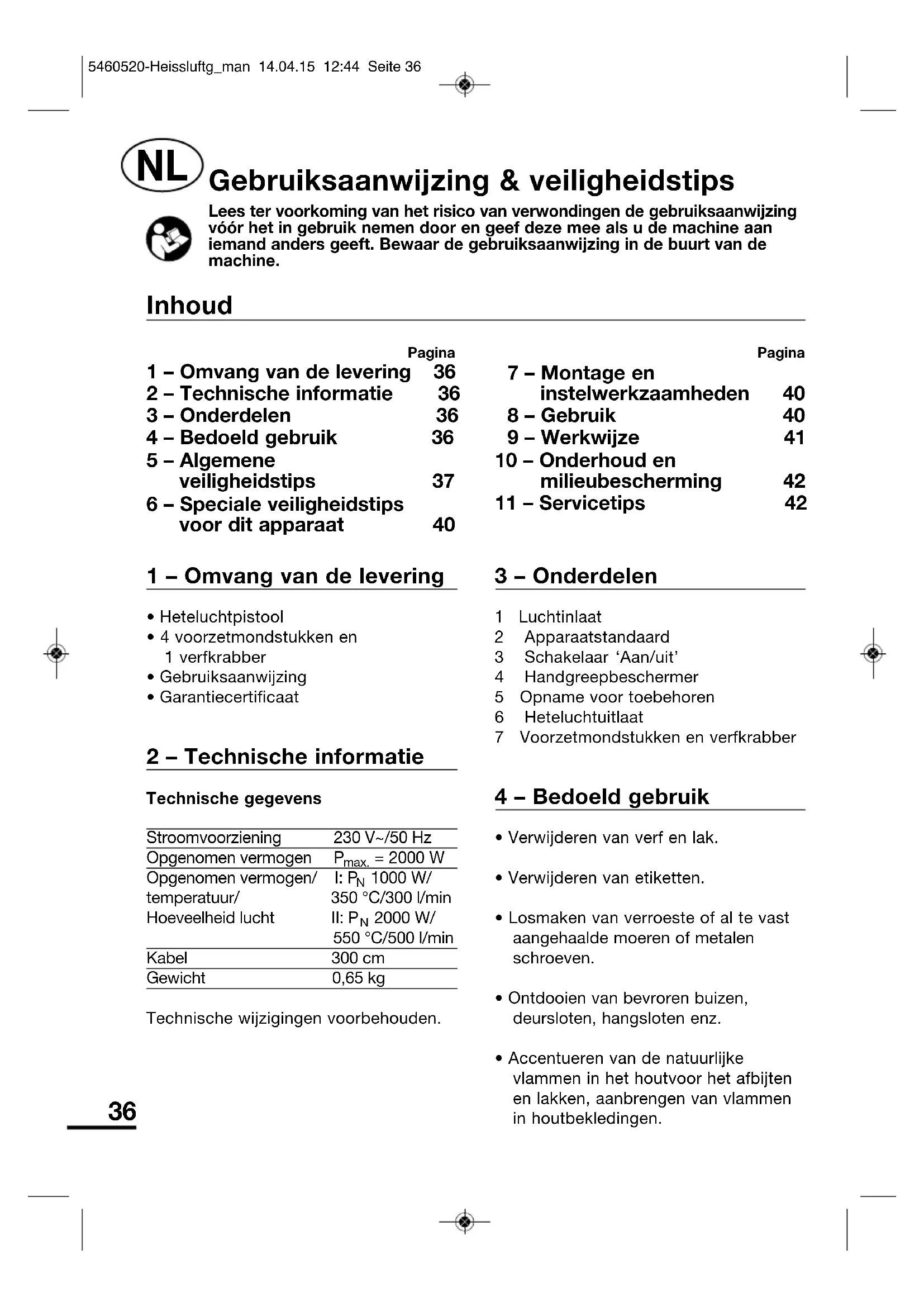 Pagina 1 – Omvang van de levering 36 2 – Technische informatie 36 3 – Onderdelen 36 4 – Bedoeld gebruik 36 5 – Algemene veiligheidstips 37 6 – Speciale veiligheidstips voor dit apparaat 40 Pagina 7 – Montage en instelwerkzaamheden 40 8 – Gebruik 40 9 – Werkwijze 41 10 – Onderhoud en milieubescherming 42 11 – Servicetips 42 Inhoud 5460520-Heissluftg_man 14.04.15 12:44 Seite 3637