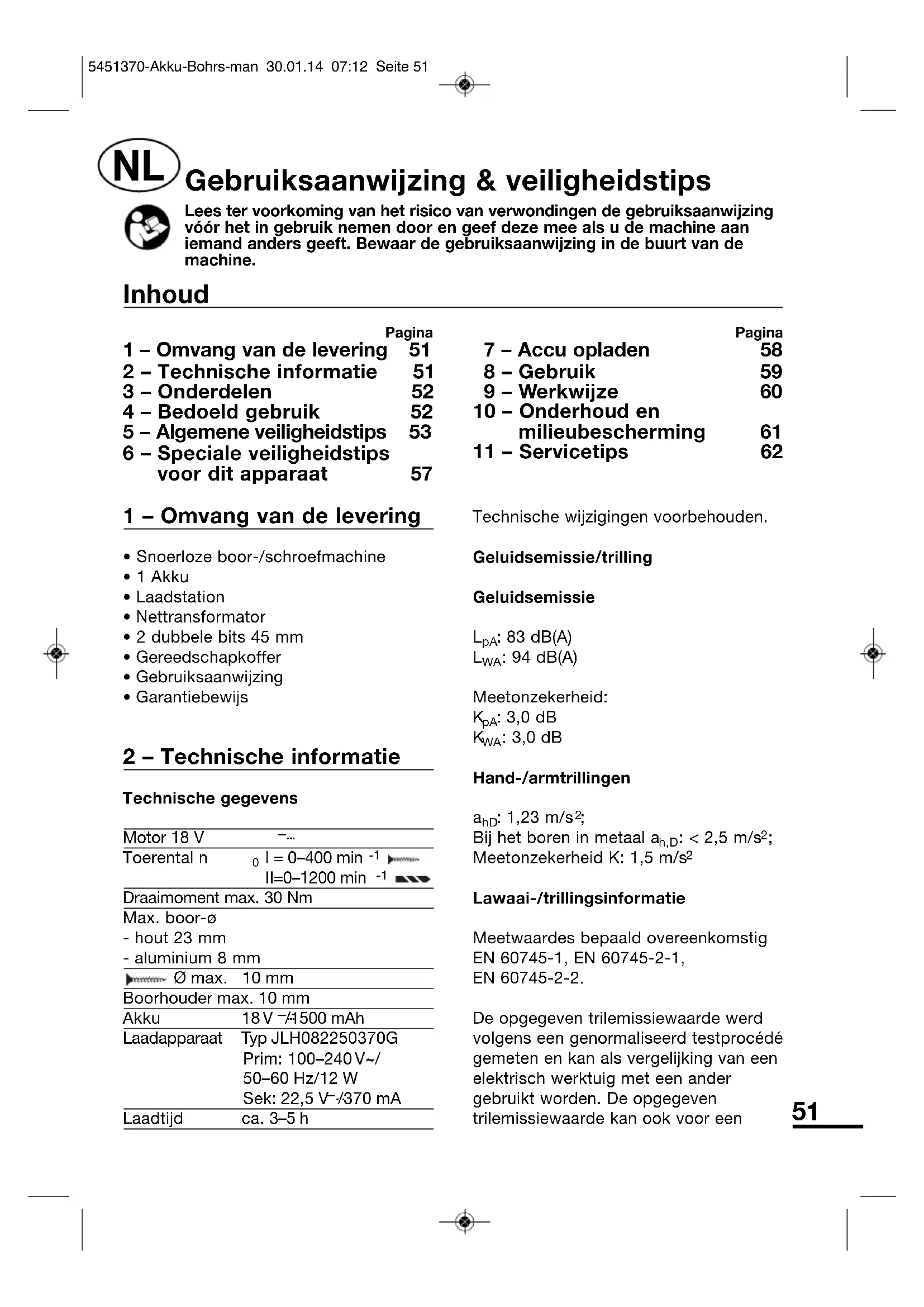 - Houd het apparaat uitsluitend vast aan de geïsoleerde greepopper - vlakken als u werkzaamheden uitvoert waarbij het inzetgereedschap verborgen stroomleidingen of de eigen stroomkabel kan raken. Contact met een stroomvoerende leiding kan ook metalen delen onder spanning zetten en een elektrische schok veroorzaken. 8 Veiligheidsinstructies voor accu/ oplaadtoestellen a Houd het oplaadtoestel op een veilige afstand van regen of nattigheid. Het binnendringen van water in een oplaadtoestel verhoogt het risico op een elektrische schok. b Laad de accu’s enkel op in oplaadtoestellen, die door de fabrikant aanbevolen worden. Voor een oplaadtoestel, dat voor een bepaald accutype geschikt is, bestaat er brandgevaar als het met andere accu’s gebruikt wordt. c Laad geen vreemde accu’s. Het oplaadtoestel is enkel voor het opladen van de bijgeleverde accu met de in de Technische Gegevens aangegeven spanningen geschikt. In het andere geval bestaat er brand- en ontploffingsgevaar. d Houd het oplaadtoestel netjes. Door vervuiling bestaat het gevaar voor een elektrische schok. 5451370-Akku-Bohrs-man 30.01.14 07:12 Seite 5657 e Controleer telkens vóór gebruik oplaadtoestel, kabel en stekker. Gebruik het oplaadtoestel niet voor zover u beschadigingen vaststelt. Open het oplaadtoestel niet zelf en laat het enkel door gekwalificeerd, geschoold personeel en uitsluitend met originele reserveonderdelen repareren. Beschadigde oplaad - toestellen, kabel en stekker verhogen het risico op een elektrische schok. f Bedien het oplaadtoestel niet op een licht ontvlambare ondergrond (bijvoorbeeld papier, textiel etc.) c.q. in een ontvlambare omgeving. Wegens de bij het opladen opduikende verwarming van het oplaadtoestel bestaat er brandgevaar. g Bij een verkeerde toepassing kan er vloeistof uit de accu vrijkomen. Vermijd het contact daarmee. Bij toevallig contact met water afspoelen. Als de vloeistof in de ogen komt, doet u aanvullend beroep op medische hulp. Vrijkomende accuvloeistof kan tot huidirritaties of brandwonden leiden. h Open de accu niet. Er bestaat gevaar voor een kortsluiting. i Bescherm de accu tegen hitte, bijvoorbeeld ook tegen aanhoudende zonnestraling, en vuur. Er bestaat ontploffingsgevaar. j De accu niet kortsluiten. Er bestaat ontploffingsgevaar. k Bij beschadiging en een onoordeelkundig gebruik van de accu’s kunnen er dampen vrijkomen. Voer frisse lucht aan en raadpleeg bij klachten een arts. De dampen kunnen de luchtwegen irriteren. 6 – Speciale veiligheidstips voor dit apparaat