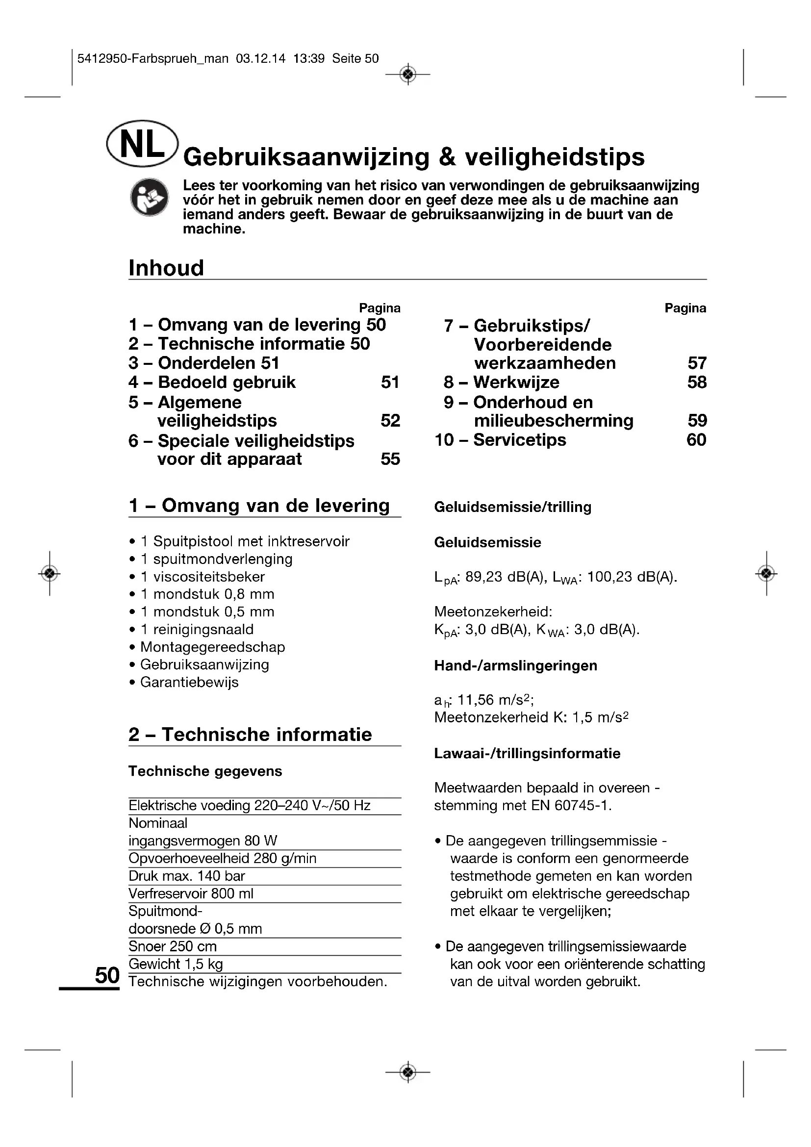 - 1 Spuitpistool met inktreservoir• 1 spuitmondverlenging• 1 viscositeitsbeker• 1 mondstuk 0,8 mm• 1 mondstuk 0,5 mm• 1 reinigingsnaald• Montagegereedschap• Gebruiksaanwijzing• Garantiebewijs 2 – Technische informatie Technische gegevensElektrische voeding 220–240 V~/50 HzNominaalingangsvermogen 80 WOpvoerhoeveelheid 280 g/minDruk max. 140 barVerfreservoir 800 mlSpuitmond-doorsnede Ø 0,5 mm Snoer 250 cmGewicht 1,5 kgTechnische wijzigingen voorbehouden.Geluidsemissie/trillingGeluidsemissie