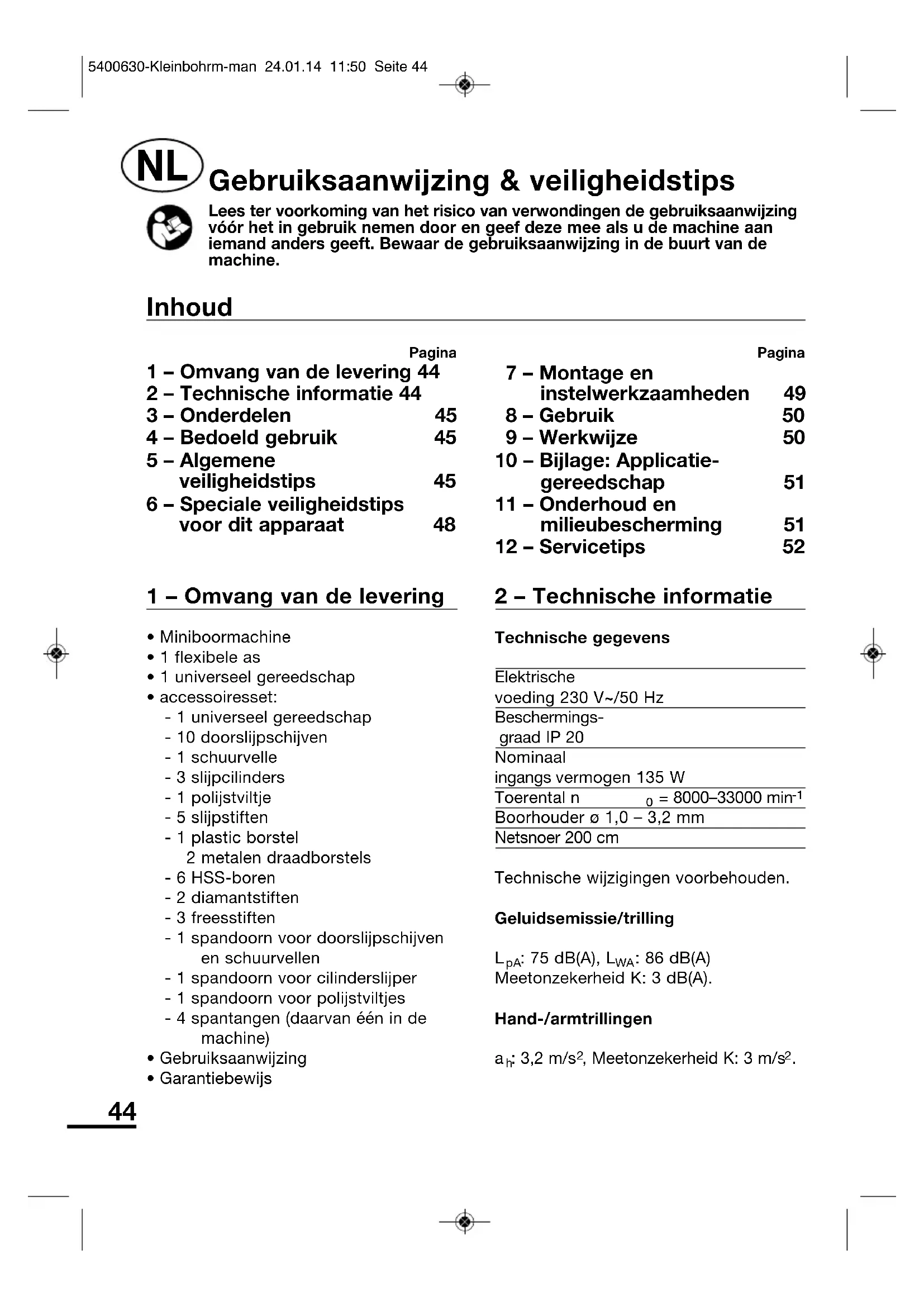 Gebruiksaanwijzing & veiligheidstips Lees ter voorkoming van het risico van verwondingen de gebruiksaanwijzingvóór het in gebruik nemen door en geef deze mee als u de machine aaniemand anders geeft. Bewaar de gebruiksaanwijzing in de buurt van demachine. Pagina 1 – Omvang van de levering 44 2 – Technische informatie 44 3 – Onderdelen 45 4 – Bedoeld gebruik 45 5 – Algemene veiligheidstips 45 6 – Speciale veiligheidstips voor dit apparaat 48 Pagina 7 – Montage en instelwerkzaamheden 49 8 – Gebruik 50 9 – Werkwijze 50 10 – Bijlage: Applicatie - gereedschap 51 11 – Onderhoud en milieubescherming 51 12 – Servicetips 52 Inhoud