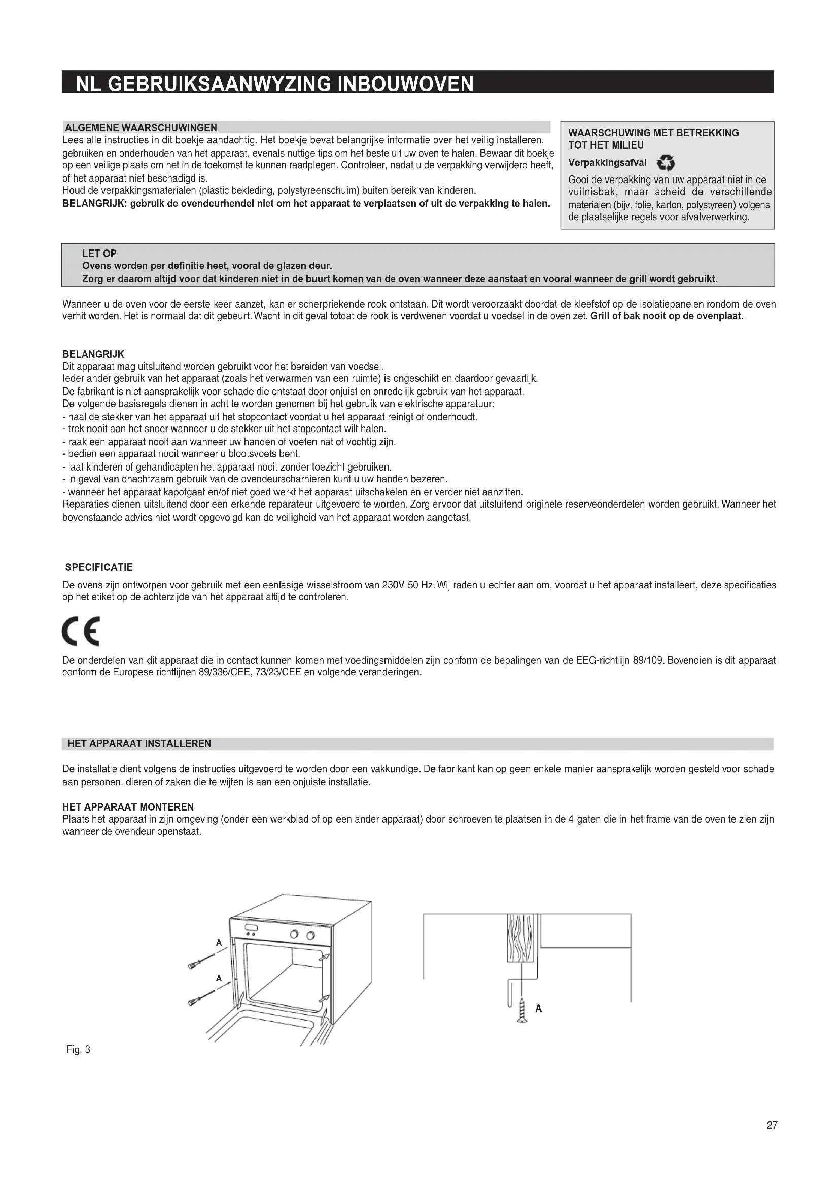 ALGEMENE WAARSCHUWINGEN Lees alle instructies in dit boekje aandachtig. Het boekje bevat belangrijke informatie over het veilig installeren, gebruiken en onderhouden van het apparaat, evenals nuttige tips om het beste uit uw oven te halen. Bewaar dit boekje op een veilige plaats om het in de toekomst te kunnen raadplegen. Controleer, nadat u de verpakking verwijderd heeft, of het apparaat niet beschadigd is. Houd de verpakkingsmaterialen (plastic bekleding, polystyreenschuim) buiten bereik van kinderen. BELANGRIJK: gebruik de ovendeurhendel niet om het apparaat te verplaatsen of uit de verpakking te halen. LET OP Ovens worden per definitie heet, vooral de glazen deur. Zorg er daarom altijd voor dat kinderen niet in de buurt komen van de oven wanneer deze aanstaat en vooral wanneer de grill wordt gebruikt. Wanneer u de oven voor de eerste keer aanzet, kan er scherpriekende rook ontstaan. Dit wordt veroorzaakt doordat de kleefstof op de isolatiepanelen rondom de oven verhit worden. Het is normaal dat dit gebeurt. Wacht in dit geval totdat de rook is verdwenen voordat u voedsel in de oven zet. Grill of bak nooit op de ovenplaat. BELANGRIJK Dit apparaat mag uitsluitend worden gebruikt voor het bereiden van voedsel. Ieder ander gebruik van het apparaat (zoals het verwarmen van een ruimte) is ongeschikt en daardoor gevaarlijk. De fabrikant is niet aansprakelijk voor schade die ontstaat door onjuist en onredelijk gebruik van het apparaat. De volgende basisregels dienen in acht te worden genomen bij het gebruik van elektrische apparatuur: - haal de stekker van het apparaat uit het stopcontact voordat u het apparaat reinigt of onderhoudt. - trek nooit aan het snoer wanneer u de stekker uit het stopcontact wilt halen. - raak een apparaat nooit aan wanneer uw handen of voeten nat of vochtig zijn. - bedien een apparaat nooit wanneer u blootsvoets bent. - laat kinderen of gehandicapten het apparaat nooit zonder toezicht gebruiken. - in geval van onachtzaam gebruik van de ovendeurscharnieren kunt u uw handen bezeren. - wanneer het apparaat kapotgaat en/of niet goed werkt het apparaat uitschakelen en er verder niet aanzitten. Reparaties dienen uitsluitend door een erkende reparateur uitgevoerd te worden. Zorg ervoor dat uitsluitend originele reserveonderdelen worden gebruikt. Wanneer het bovenstaande advies niet wordt opgevolgd kan de veiligheid van het apparaat worden aangetast. SPECIFICATIE De ovens zijn ontworpen voor gebruik met een eenfasige wisselstroom van 230V 50 Hz. Wij raden u echter aan om, voordat u het appar aat installeert, deze specificaties op het etiket op de achterzijde van het apparaat altijd te controleren. De onderdelen van dit apparaat die in contact kunnen komen met voedingsmiddelen zijn conform de bepalingen van de EEG-richtlijn 89/109. Bovendien is dit apparaat conform de Europese richtlijnen 89/336/CEE, 73/23/CEE en volgende veranderingen.