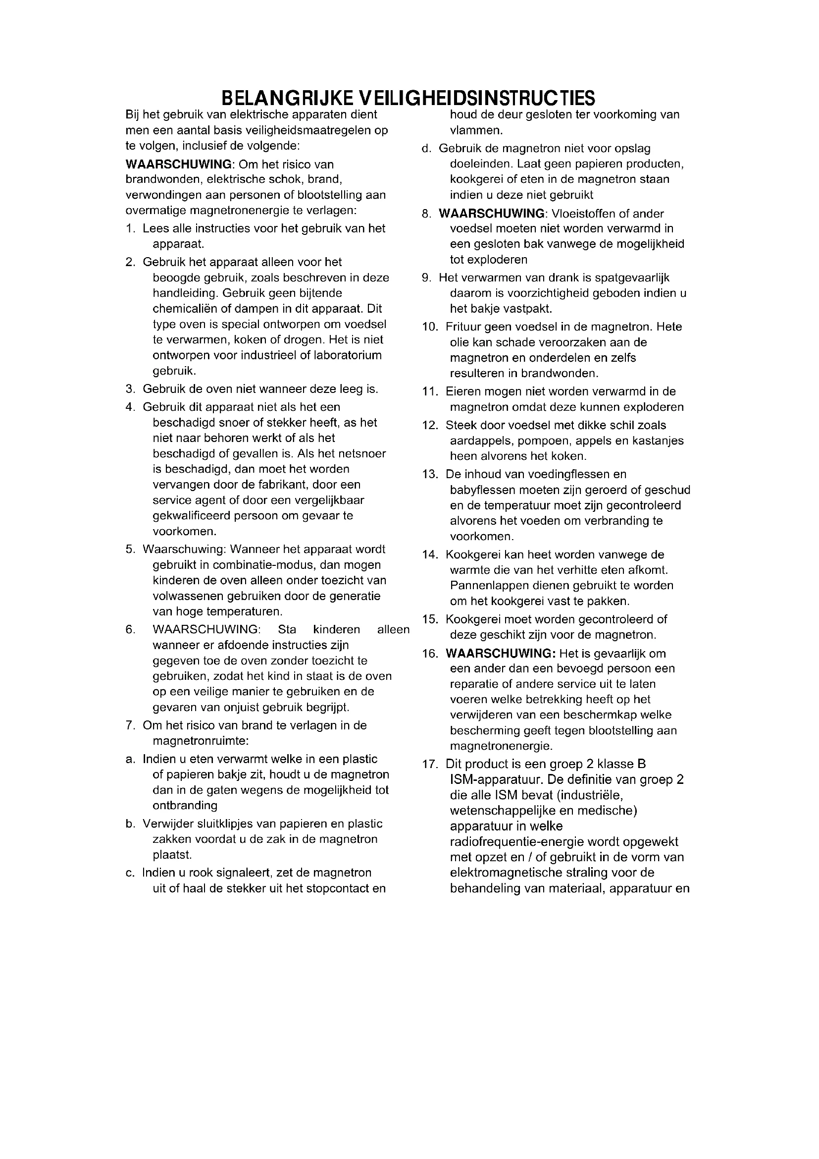 magnetronruimte: a. Indien u eten verwarmt welke in een plastic of papieren bakje zit, houdt u de magnetron dan in de gaten wegens de mogelijkheid tot ontbranding b. Verwijder sluitklipjes van papieren en plastic zakken voordat u de zak in de magnetron plaatst. c. Indien u rook signaleert, zet de magnetron uit of haal de stekker uit het stopcontact en houd de deur gesloten ter voorkoming van vlammen. d. Gebruik de magnetron niet voor opslag doeleinden. Laat geen papieren producten, kookgerei of eten in de magnetron staan indien u deze niet gebruikt