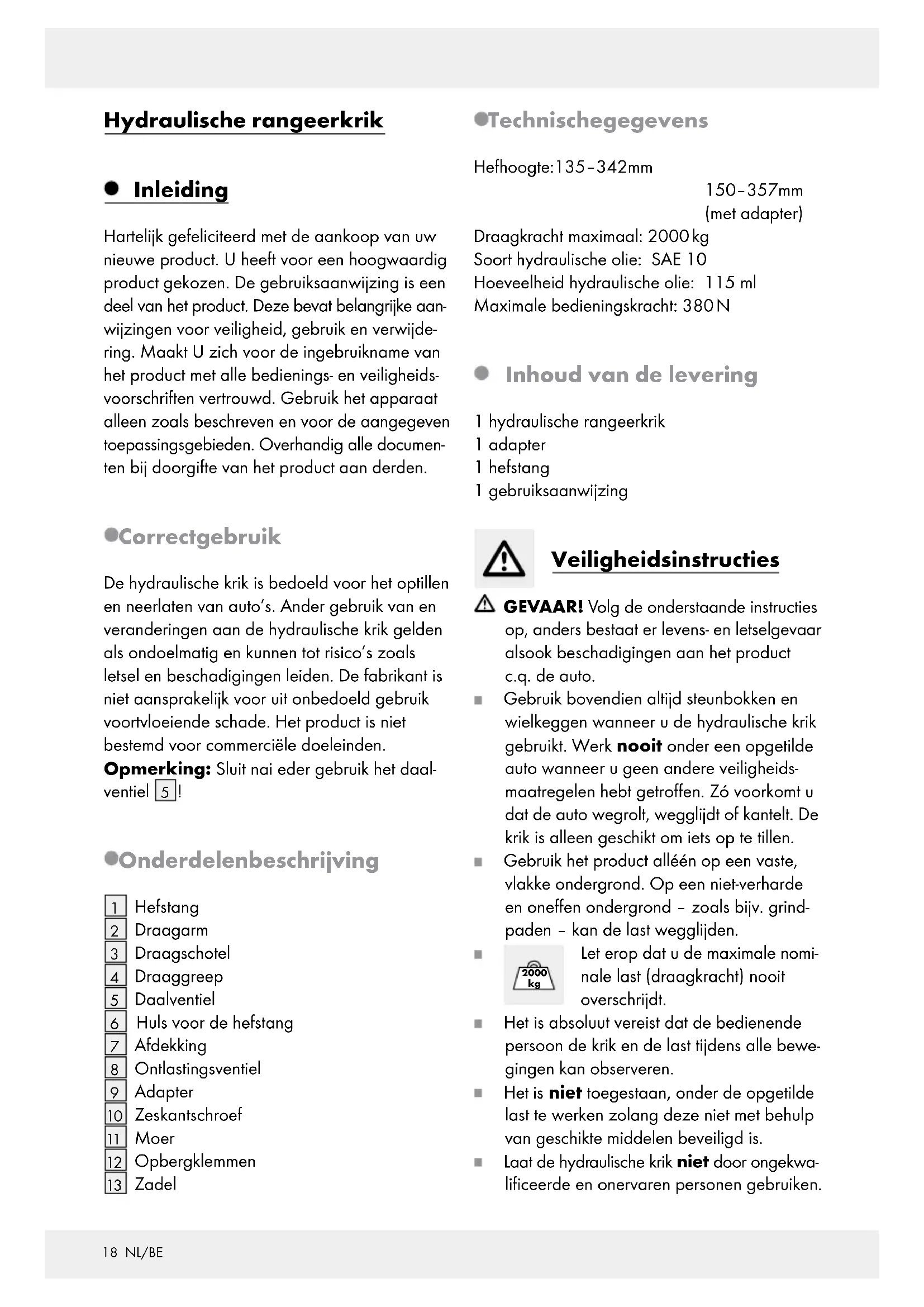 Zadel Technische gegevens Hefhoogte: 135–342 mm 150–357 mm (met adapter) Draagkracht maximaal: 2000 kg Soort hydraulische olie: SAE 10 Hoeveelheid hydraulische olie: 115 ml Maximale bedieningskracht: 380 N Inhoud van de levering 1 hydraulische rangeerkrik 1 adapter 1 hefstang 1 gebruiksaanwijzing Veiligheidsinstructies GEVAAR! Volg de onderstaande instructies op, anders bestaat er levens- en letselgevaar alsook beschadigingen aan het product c.q. de auto. Gebruik bovendien altijd steunbokken en wielkeggen wanneer u de hydraulische krik gebruikt. Werk nooit onder een opgetilde auto wanneer u geen andere veiligheids- maatregelen hebt getroffen. Zó voorkomt u dat de auto wegrolt, wegglijdt of kantelt. De krik is alleen geschikt om iets op te tillen. Gebruik het product alléén op een vaste, vlakke ondergrond. Op een niet-verharde en oneffen ondergrond – zoals bijv. grind- paden – kan de last wegglijden.
