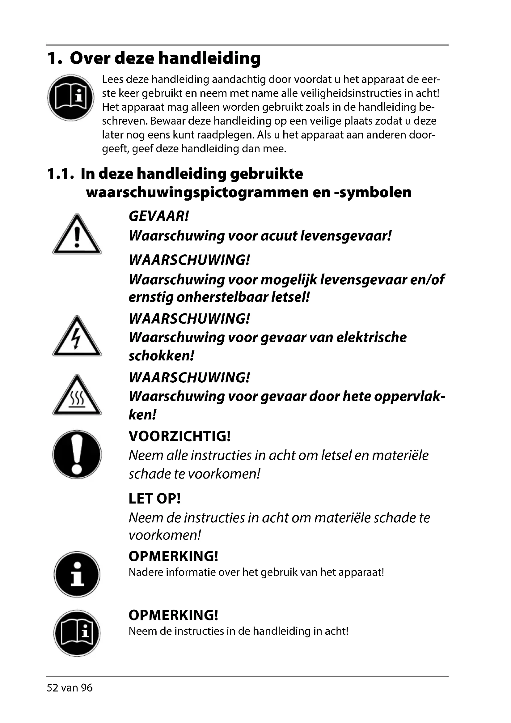 Lees deze handleiding aandachtig door voordat u het apparaat de eer- ste keer gebruikt en neem met name alle veiligheidsinstructies in acht! Het apparaat mag alleen worden gebruikt zoals in de handleiding be- schreven. Bewaar deze handleiding op een veilige plaats zodat u deze later nog eens kunt raadplegen. Als u het apparaat aan anderen door- geeft, geef deze handleiding dan mee. 1.1. In deze handleiding gebruikte waarschuwingspictogrammen en -symbolen GEVAAR! Waarschuwing voor acuut levensgevaar! WAARSCHUWING! Waarschuwing voor mogelijk levensgevaar en/of ernstig onherstelbaar letsel! WAARSCHUWING! Waarschuwing voor gevaar van elektrische schokken! WAARSCHUWING! Waarschuwing voor gevaar door hete oppervlak- ken! VOORZICHTIG! Neem alle instructies in acht om letsel en materiële schade te voorkomen! LET OP! Neem de instructies in acht om materiële schade te voorkomen! OPMERKING! Nadere informatie over het gebruik van het apparaat! OPMERKING! Neem de instructies in de handleiding in acht! 16054 MULI eCommerce Content RC1.indb 5216054 MULI eCommerce Content RC1.indb 52 05.02.2015 11:26:3305.02.2015 11:26:3353 van 96