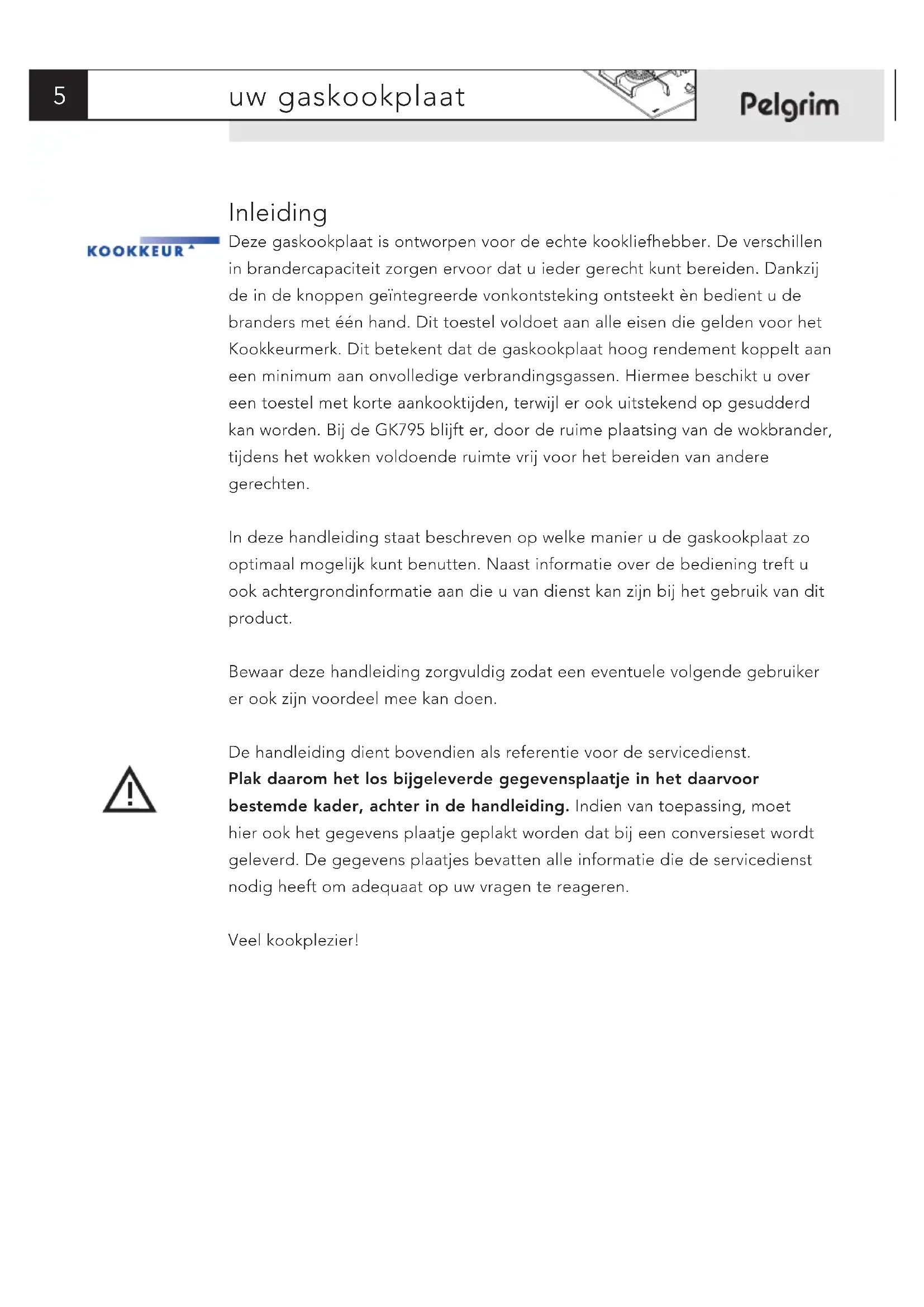 Inleiding Deze gaskookplaat is ontworpen voor de echte kookliefhebber. De verschillen in brandercapaciteit zorgen ervoor dat u ieder gerecht kunt bereiden. Dankzij de in de knoppen geïntegreerde vonkontsteking ontsteekt èn bedient u de branders met één hand. Dit toestel voldoet aan alle eisen die gelden voor het Kookkeurmerk. Dit betekent dat de gaskookplaat hoog rendement koppelt aan een minimum aan onvolledige verbrandingsgassen. Hiermee beschikt u over een toestel met korte aankooktijden, terwijl er ook uitstekend op gesudderd kan worden. Bij de GK795 blijft er, door de ruime plaatsing van de wokbrander, tijdens het wokken voldoende ruimte vrij voor het bereiden van andere gerechten. In deze handleiding staat beschreven op welke manier u de gaskookplaat zo optimaal mogelijk kunt benutten. Naast informatie over de bediening treft u ook achtergrondinformatie aan die u van dienst kan zijn bij het gebruik van dit product. Bewaar deze handleiding zorgvuldig zodat een eventuele volgende gebruiker er ook zijn voordeel mee kan doen. De handleiding dient bovendien als referentie voor de servicedienst. Plak daarom het los bijgeleverde gegevensplaatje in het daarvoor bestemde kader, achter in de handleiding. Indien van toepassing, moet hier ook het gegevens plaatje geplakt worden dat bij een conversieset wordt geleverd. De gegevens plaatjes bevatten alle informatie die de servicedienst nodig heeft om adequaat op uw vragen te reageren. Veel kookplezier!veiligheid
