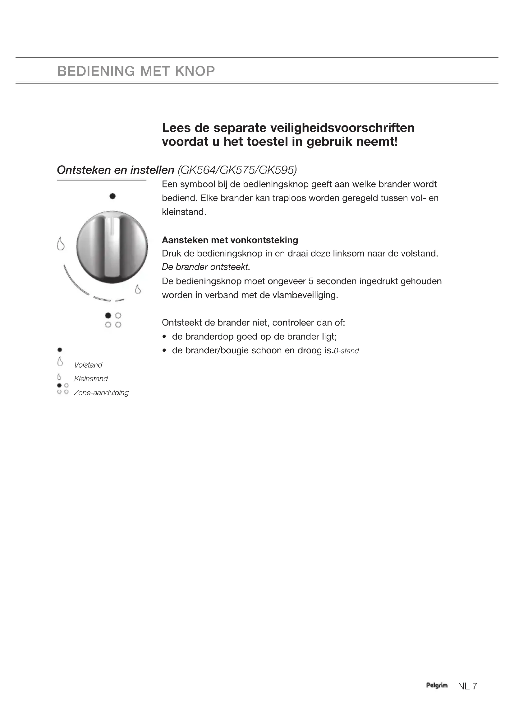 Lees de separate veiligheidsvoorschriften voordat u het toestel in gebruik neemt! Ontsteken en instellen (GK564/GK575/GK595) Een symbool bij de bedieningsknop geeft aan welke brander wordt bediend. Elke brander kan traploos worden geregeld tussen vol- en kleinstand. Aansteken met vonkontsteking Druk de bedieningsknop in en draai deze linksom naar de volstand. De brander ontsteekt. De bedieningsknop moet ongeveer 5 seconden ingedrukt gehouden worden in verband met de vlambeveiliging. Ontsteekt de brander niet, controleer dan of: