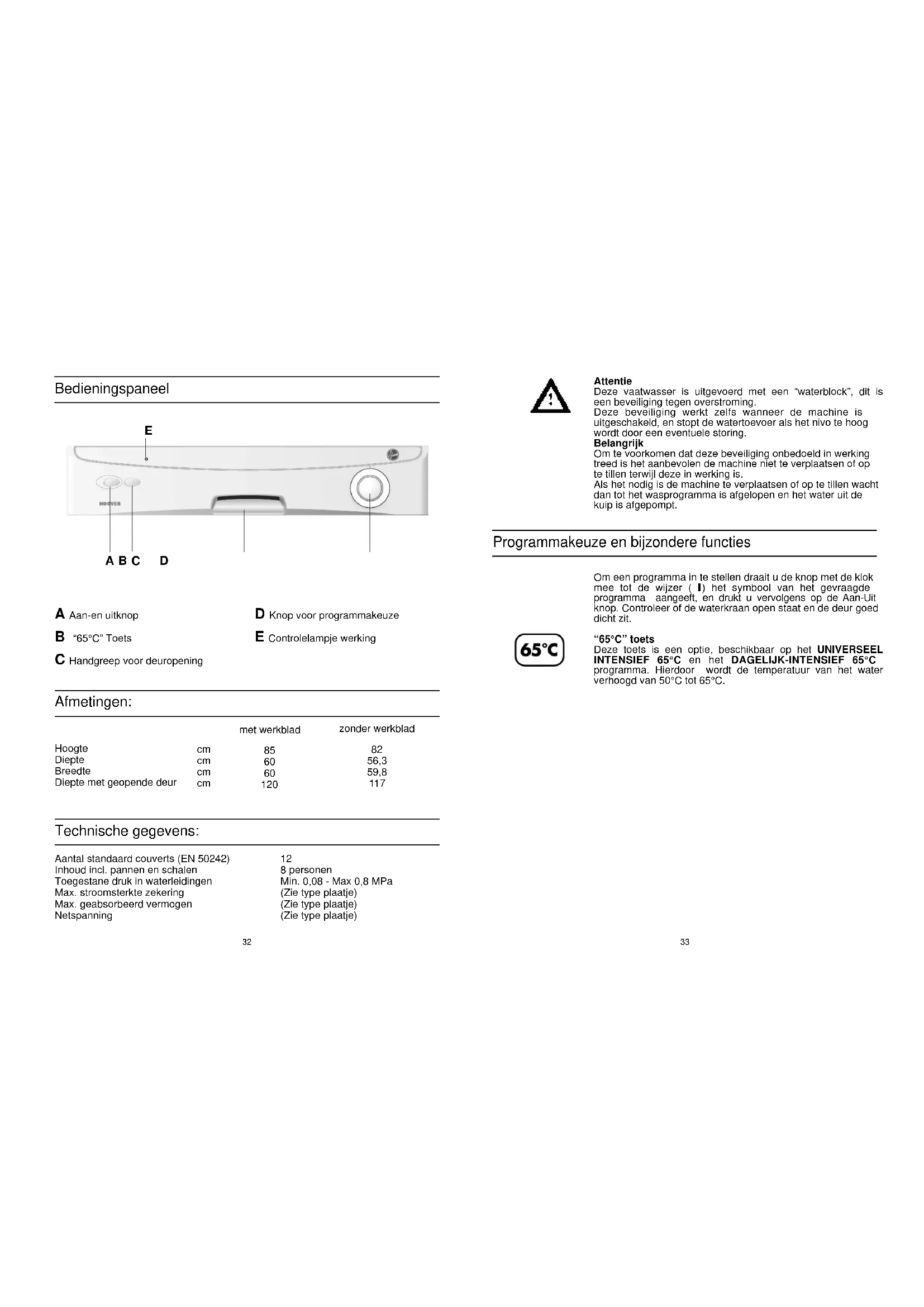 | 3 + 65°C = | DAGELIJK - INTENSIEF 65°C | Voor het wassen van zeer verontreinigde pannen en serviesgoed. Voor dagelijks gebruik. |