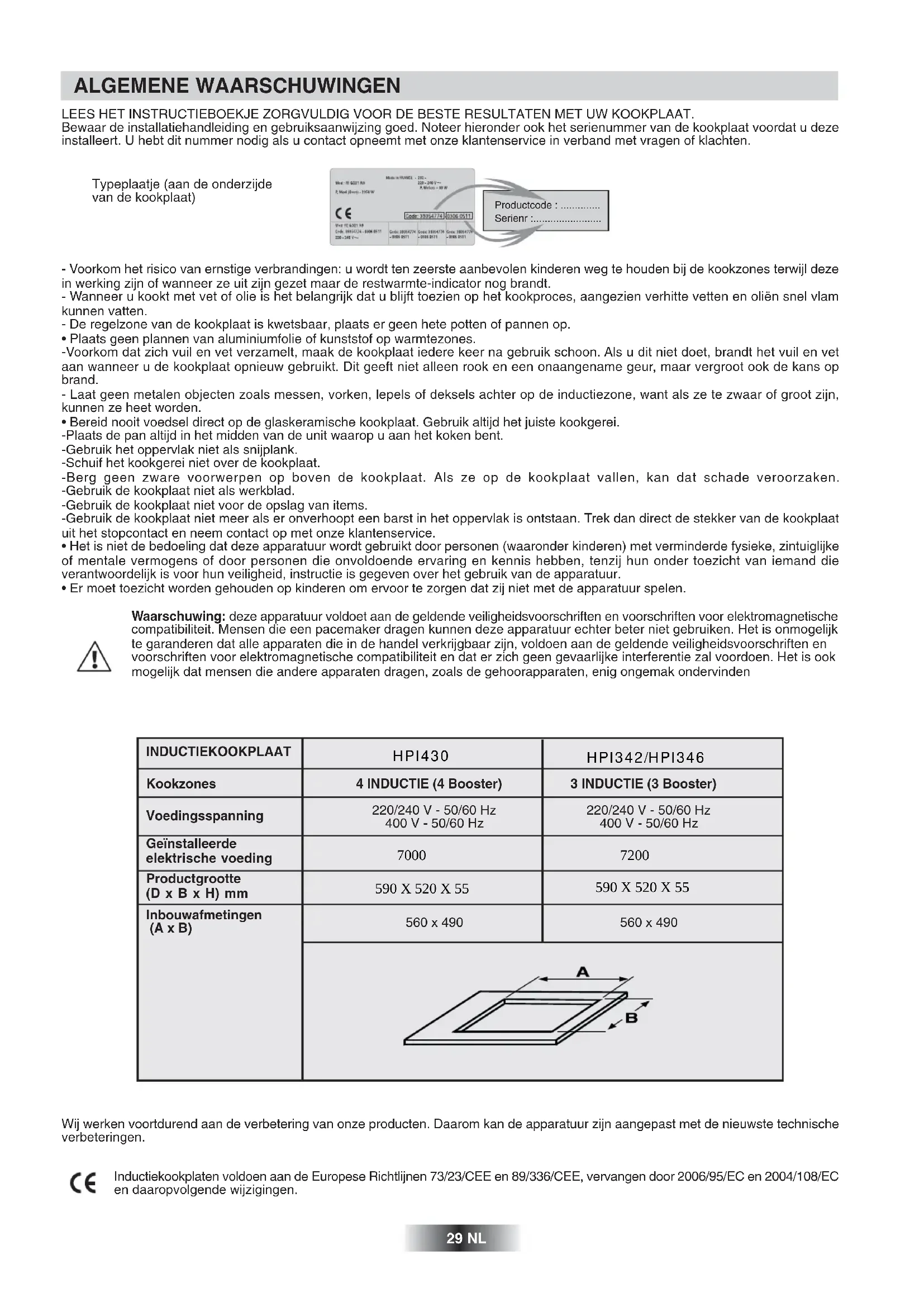- Er moet toezicht worden gehouden op kinderen om ervoor te zorgen dat zij niet met de apparatuur spelen. Waarschuwing: deze apparatuur voldoet aan de geldende veiligheidsvoorschriften en voorschriften voor elektromagnetische compatibiliteit. Mensen die een pacemaker dragen kunnen deze apparatuur echter beter niet gebruiken. Het is onmogelijk te garanderen dat alle apparaten die in de handel verkrijgbaar zijn, voldoen aan de geldende veiligheidsvoorschriften en voorschriften voor elektromagnetische compatibiliteit en dat er zich geen gevaarlijke interferentie zal voordoen. Het is ook mogelijk dat mensen die andere apparaten dragen, zoals de gehoorapparaten, enig ongemak ondervinden ALGEMENE WAARSCHUWINGEN Typeplaatje (aan de onderzijde van de kookplaat) Productcode : .............. Serienr :........................ INDUCTIEKOOKPLAAT Kookzones Voedingsspanning Geïnstalleerde elektrische voeding Productgrootte (D x B x H) mm Inbouwafmetingen (A x B) 4 INDUCTIE (4 Booster) 220/240 V - 50/60 Hz 400 V - 50/60 Hz 560 x 490 3 INDUCTIE (3 Booster) 220/240 V - 50/60 Hz 400 V - 50/60 Hz 560 x 490 29 NL 590 X 520 X 55