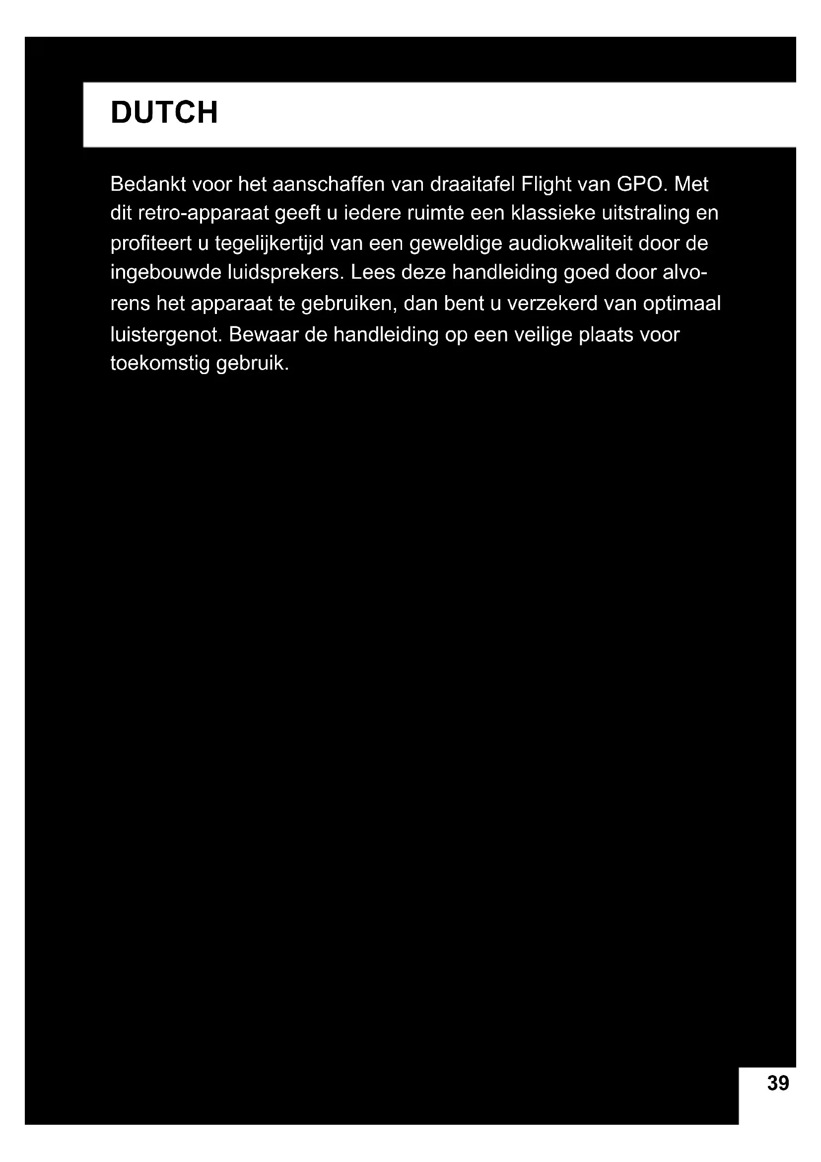 - Débranchez l’alimentation après utilisation. ASSISTANCE Pour plus de conseils ou d’assistance, visitez www.gporetro.com. Veuillez noter que pour votre propre sécurité, vous ne DEVRIEZ PAS essayer d’ouvrir le boîtier de l’unité. Le produit ne contient aucune pièce réparable par l’utilisateur, et si vous ouvrez son boîtier, la garantie sera nulle.3939 DUTCH Bedankt voor het aanschaffen van draaitafel Flight van GPO. Met dit retro-apparaat geeft u iedere ruimte een klassieke uitstraling en proteert u tegelijkertijd van een geweldige audiokwaliteit door de ingebouwde luidsprekers. Lees deze handleiding goed door alvo- rens het apparaat te gebruiken, dan bent u verzekerd van optimaal luistergenot. Bewaar de handleiding op een veilige plaats voor toekomstig gebruik.40 Uitpakken In deze verpakking: 1x draaitafel Flight 1x draaitafelnaald (reeds bevestigd) 1x anti-slipmat draaitafel (deze bevindt zich op de draaitafel) 1x DC-voedingskabel 1x RCA-kabel 1x handleiding Verwijder voorzichtig alle materialen uit de verpakking. Bewaar deze handleiding voor toekomstig gebruik. Zet het apparaat op een geschikte plaats. Vermijd schuine oppervlakken, plekken met direct zonlicht en houd het apparaat uit de buurt van hittebronnen of vochtige plekken. Houd alle ventilatiegaatjes vrij en plaats geen spullen bovenop het apparaat, omdat dit het apparaat kan beschadigen. Verwijder de naaldkap alleen van de naaldinrichting wanneer u de draaitafel wil gaan gebruiken. Houd de naaldkap op de naald als u de draaitafel niet gebruikt, om deze te beschermen tegen beschadigingen.41 Eigenschappen