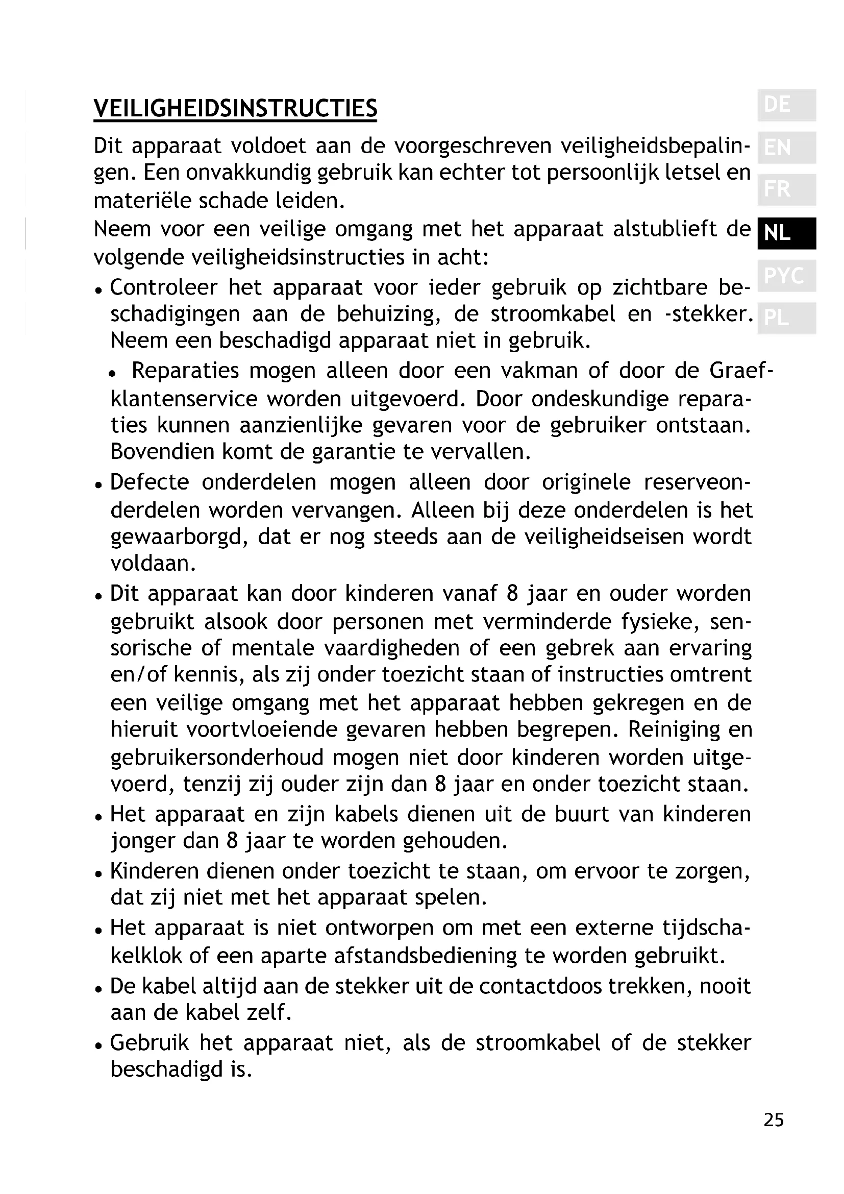 LIFT-OFF UITSCHAKELING Mocht u tijdens het koken het apparaat per ongeluk van de basis hebben ge- tild, schakelt het apparaat vanzelf uit. Dit is de zogenaamde lift-off uitscha- keling REINIGING Eerst de stekker uit de contactdoos trekken en het apparaat af laten koelen. Reinig de buitenkant van het apparaat met een zacht, vochtig doekje. Bij ster- ke verontreinigingen kan een mild reinigingsmiddel worden gebruikt. ONTKALKEN Afhankelijk van de hardheid van het water in uw gebied ontstaat op den duur kalkaanslag op de bodem en aan de binnenkant van de edelstalen kan. Hoe hoger de hardheid van het water, des te sneller ontstaat kalkaanslag. Dit heeft weliswaar geen invloed op de kwaliteit van het water, maar het kan wel de prestatie van het apparaat beïnvloeden. Daarom raden wij u aan, het ap- paraat regelmatig als volgt te ontkalken. ● Vul het apparaat driekwart met water. ● Breng dit aan de kook. ● Nadat het apparaat weer uitgeschakeld is, vult u het apparaat bovendien tot aan de MAX-markering met huishoudazijn. Opmerking: breng dit mengsel niet aan de kook. ● Laat het mengsel gedurende de nacht staan. ● Maak het apparaat leeg en spoel het meermaals met schoon water uit. Opmerking: u kunt ook andere geschikte ontkalkers gebruiken, neem hierbij de instructies van de fabrikant in acht. KLANTENSERVICE Mocht het gebeuren, dat uw Graef-apparaat defect is, dient u contact op te nemen met uw speciaalzaak of de Graef-klantenservice. VERWIJDERING Dit product mag aan het einde van zijn levensduur niet via het normale hu- ishoudelijk afval worden verwijderd. Het symbool op het product en in de gebruiksaanwijzing maken u hierop attent. De materialen dienen conform hun aanduidingen te worden gerecycled. Door het hergebruik, recyclen of andere vormen van hergebruik van oude apparaten, levert u een belangrijke bijdrage voor de bescherming van het milieu. Vraag alstublieft bij uw gemeentelijke overheid naar het desbetreffende recyclingcentrum.30 2 JAAR GARANTIE Voor dit product verlenen wij, beginnend vanaf de verkoopdatum, 24 maan- den fabrieksgarantie op mankementen, die terug te voeren zijn op produc- tie- of materiaalfouten. Uw wettelijke garantie volgens § 439 ff. BGB-E (Duits burgerlijk wetboek) blijft onaangetast. Schade, die terug te voeren is op een onvakkundige omgang of gebruik alsook mankementen, die de werking of de waarde van het apparaat slechts minimaal beïnvloeden, vallen niet onder de garantie. Bovendien zijn wij niet verantwoordelijk voor schade die ontstaat door ontbrekende of onvoldoende ontkalking en onderhoud. In dit geval komt de garantie eveneens te vervallen. Bovendien vallen transportbeschadigingen, voor zover wij hiervoor niet verantwoordelijk zijn, ook niet onder de garantie. Voor schade, die door een niet door ons of onze vertegenwoordiging uitgevo- erde reparatie ontstaat, zijn wij eveneens niet aansprakelijk. In geval van gegronde reclamaties zullen wij het gebrekkige product naar eigen inzicht repareren of vervangen door een feilloos werkend product.31