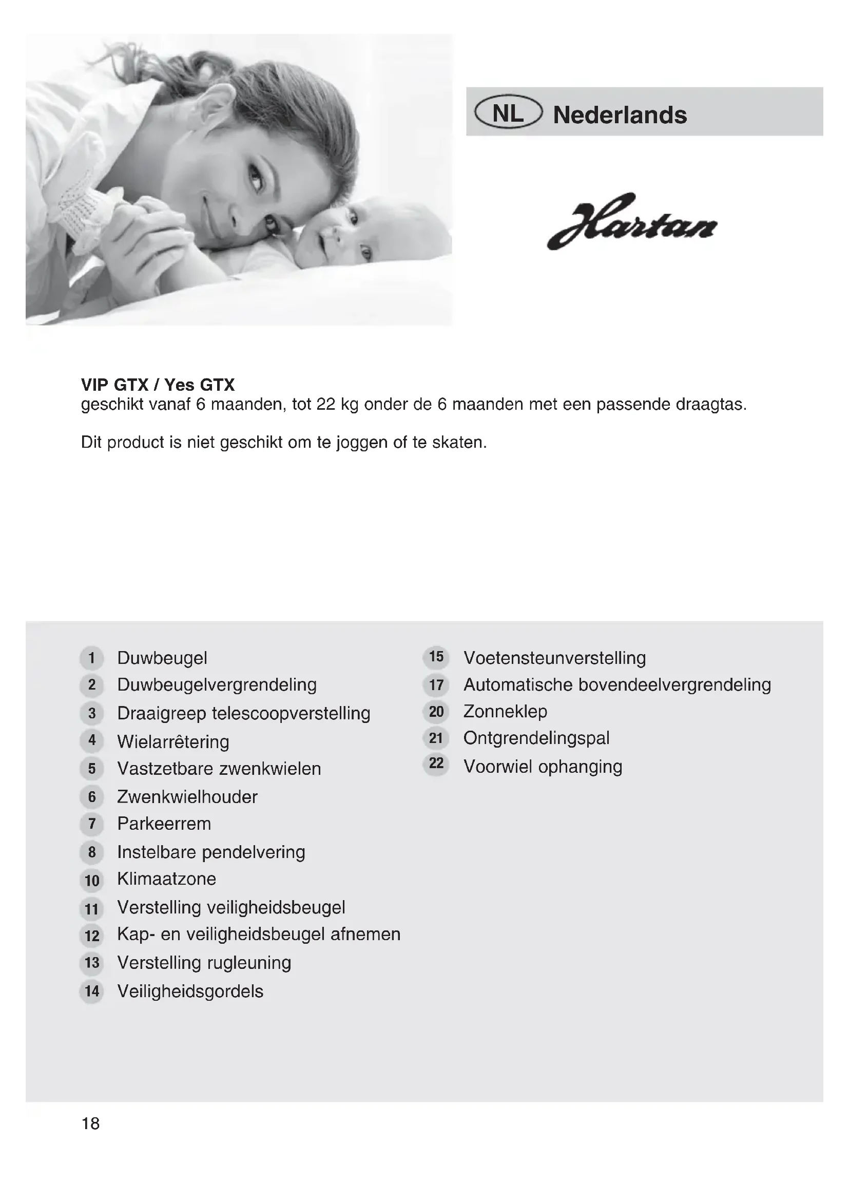 VIP GTX / Yes GTX geschikt vanaf 6 maanden, tot 22 kg onder de 6 maanden met een passende draagtas. Dit product is niet geschikt om te joggen of te skaten. Duwbeugel Duwbeugelvergrendeling Draaigreep telescoopverstelling Wielarrêtering Vastzetbare zwenkwielen Zwenkwielhouder Parkeerrem Instelbare pendelvering Klimaatzone Verstelling veiligheidsbeugel Kap- en veiligheidsbeugel afnemen Verstelling rugleuning Veiligheidsgordels Voetensteunverstelling Automatische bovendeelvergrendeling Zonneklep Ontgrendelingspal Voorwiel ophanging