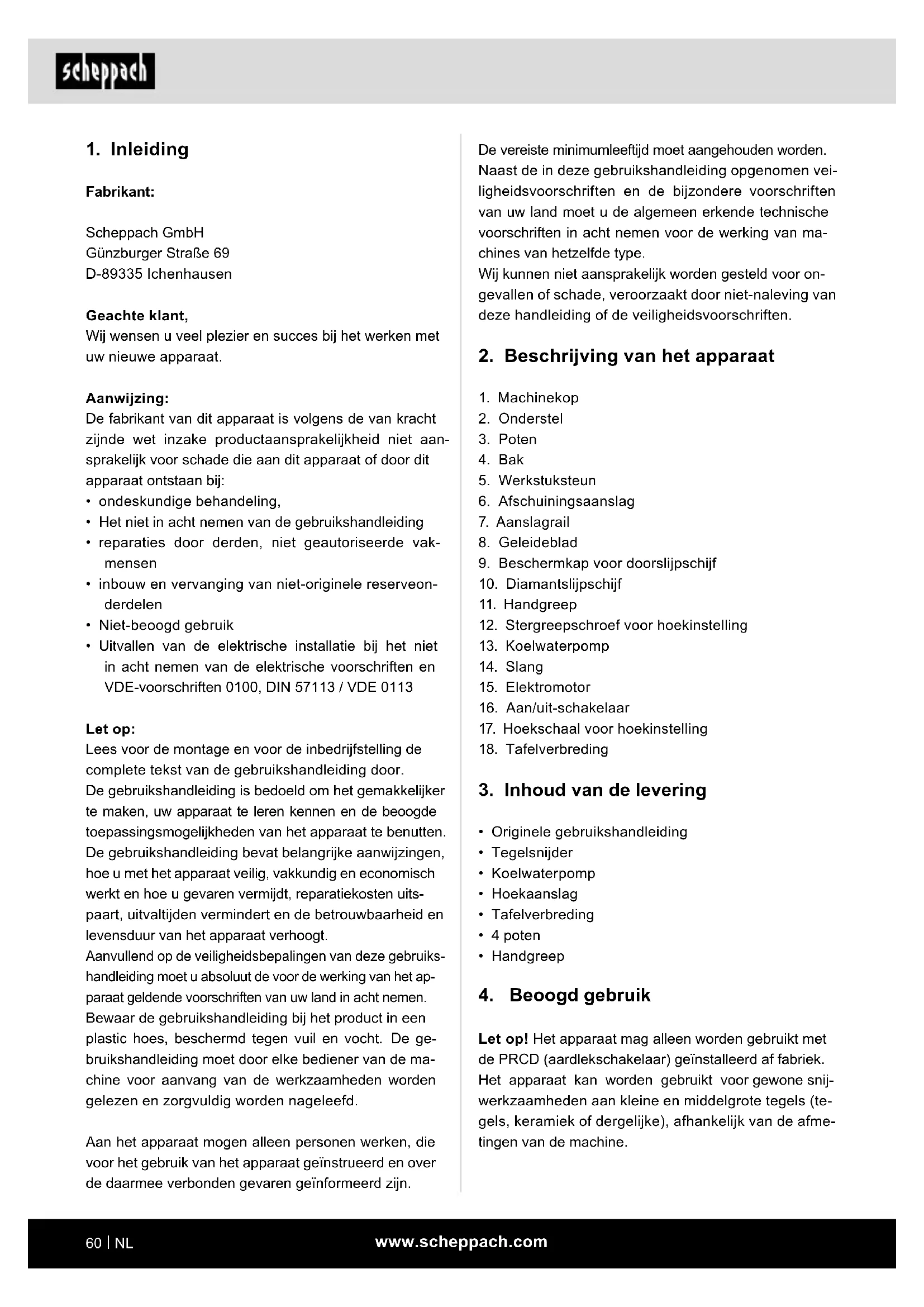Fabrikant: Scheppach GmbH Günzburger Straße 69 D-89335 Ichenhausen Geachte klant, Wij wensen u veel plezier en succes bij het werken met uw nieuwe apparaat. Aanwijzing: De fabrikant van dit apparaat is volgens de van kracht zijnde wet inzake productaansprakelijkheid niet aan- sprakelijk voor schade die aan dit apparaat of door dit apparaat ontstaan bij: