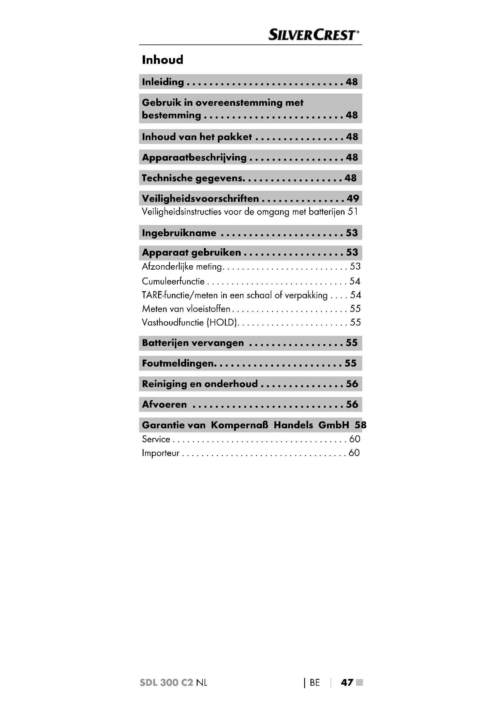 Garantie van Kompernaß Handels GmbH Geachte klant, U hebt op dit apparaat 3 jaar garantie vanaf de aankoopdatum. In geval van ge breken in dit pro- duct hebt u wettelijke rechten tegenover de verkoper van het product. Deze wettelijke rechten worden door onze hierna beschreven garantie niet beperkt. Garantievoorwaarden De garantieperiode geldt vanaf de datum van aankoop. Bewaar de kassabon zorgvuldig. U hebt hem nodig als bewijs van aankoop. Als er binnen drie jaar vanaf de aankoopdatum van dit product een materiaal- of fabricagefout optreedt, wordt - naar onze keuze - het product door ons kos- teloos gerepareerd of vervangen of wordt de koop- prijs terugbetaald. Voorwaarde voor deze garantie is dat het defecte apparaat en het aankoopbewijs (kassabon) binnen de termijn van drie jaar worden overlegd en dat kort wordt omschreven waaruit het gebrek bestaat en wanneer het is opgetreden. Wanneer het defect door onze garantie wordt ge- dekt, krijgt u het gerepareerde product of een nieuw product retour. Met de reparatie of vervanging van het product begint er geen nieuwe garantieperiode. Garantieperiode en wettelijke aanspra- ken bij gebreken De garantieperiode wordt door deze waarborg niet verlengd. Dat geldt ook voor vervangen en gerepareerde onderdelen. Eventueel al bij aankoop aanwezige schade en gebreken moeten meteen na het uitpakken worden gemeld. Voor reparaties na afloop van de garantieperiode worden kosten in rekening gebracht. Garantieomvang Het apparaat is op basis van strenge kwaliteitsnormen met de grootst mogelijke zorg vervaardigd en vooraf- gaand aan de levering nauwkeurig gecontroleerd. De garantie geldt voor materiaal- of fabricagefou- ten. Deze garantie geldt niet voor productonder- delen die onderhevig zijn aan normale slijtage en die daarom als slijtonderdelen worden beschouwd, of voor schade aan breekbare onderdelen zoals schakelaars, accu‘s of onderdelen die van glas zijn gemaakt.SDL 300 C2 NL