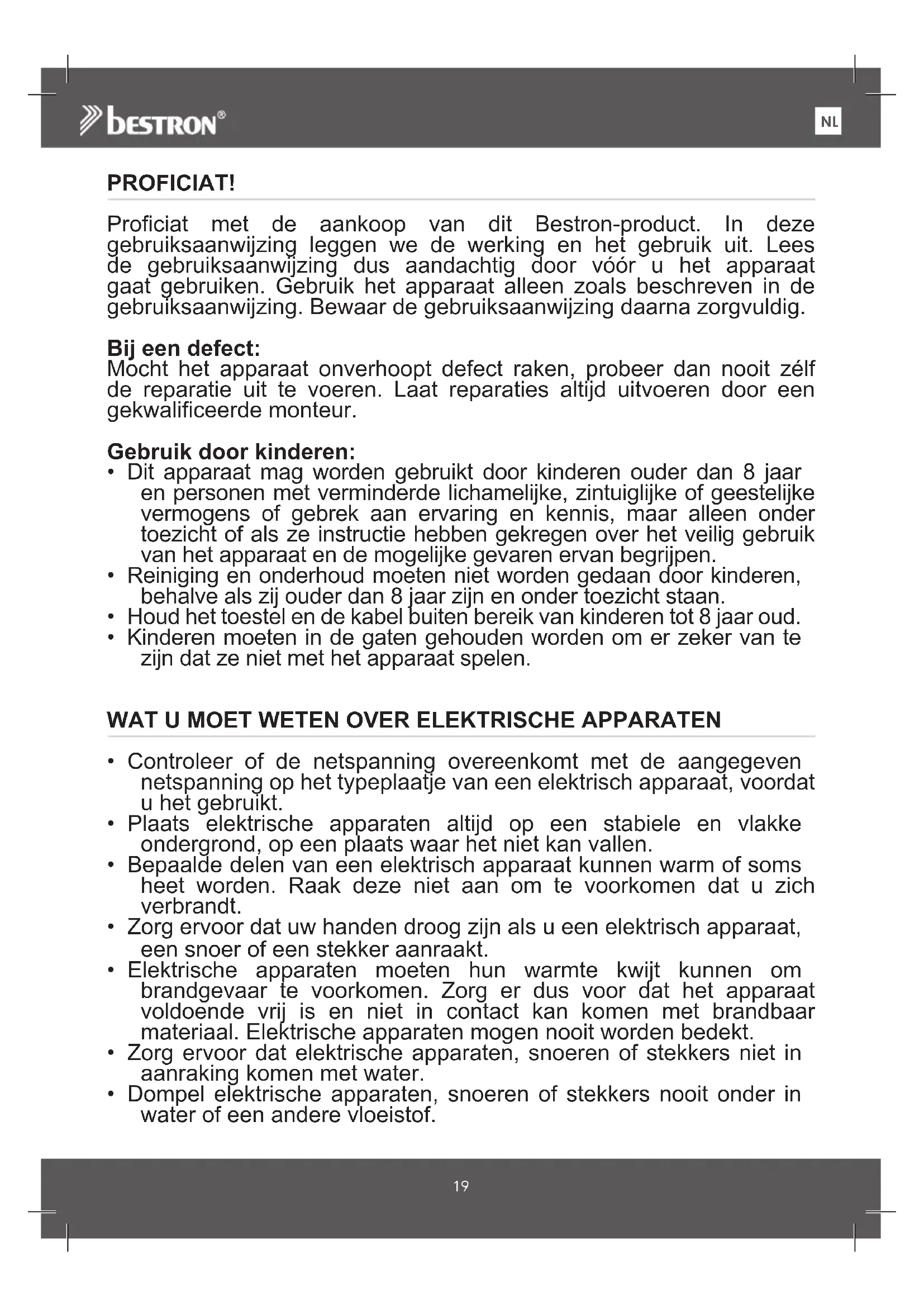 PROFICIAT! Proficiat met de aankoop van dit Bestron-product. In deze gebruiksaanwijzing leggen we de werking en het gebruik uit. Lees de gebruiksaanwijzing dus aandachtig door vóór u het apparaat gaat gebruiken. Gebruik het apparaat alleen zoals beschreven in de gebruiksaanwijzing. Bewaar de gebruiksaanwijzing daarna zorgvuldig. Bij een defect: Mocht het apparaat onverhoopt defect raken, probeer dan nooit zélf de reparatie uit te voeren. Laat reparaties altijd uitvoeren door een gekwalificeerde monteur. Gebruik door kinderen: