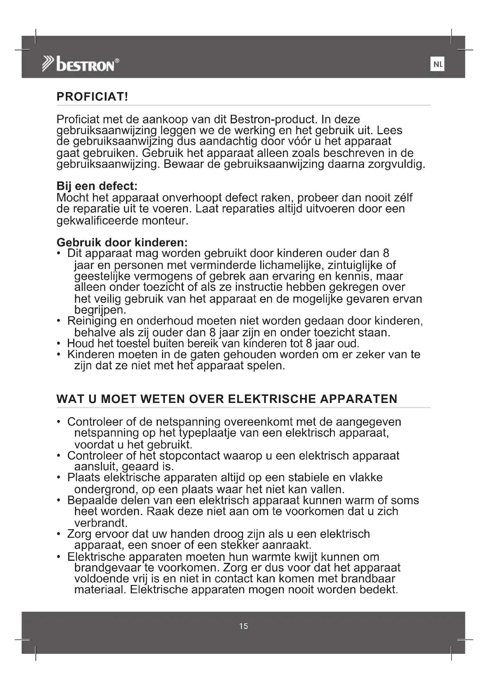 FRPROFICIAT! Proficiat met de aankoop van dit Bestron-product. In deze gebruiksaanwijzing leggen we de werking en het gebruik uit. Lees de gebruiksaanwijzing dus aandachtig door vóór u het apparaat gaat gebruiken. Gebruik het apparaat alleen zoals beschreven in de gebruiksaanwijzing. Bewaar de gebruiksaanwijzing daarna zorgvuldig. Bij een defect: Mocht het apparaat onverhoopt defect raken, probeer dan nooit zélf de reparatie uit te voeren. Laat reparaties altijd uitvoeren door een gekwalificeerde monteur. Gebruik door kinderen:
