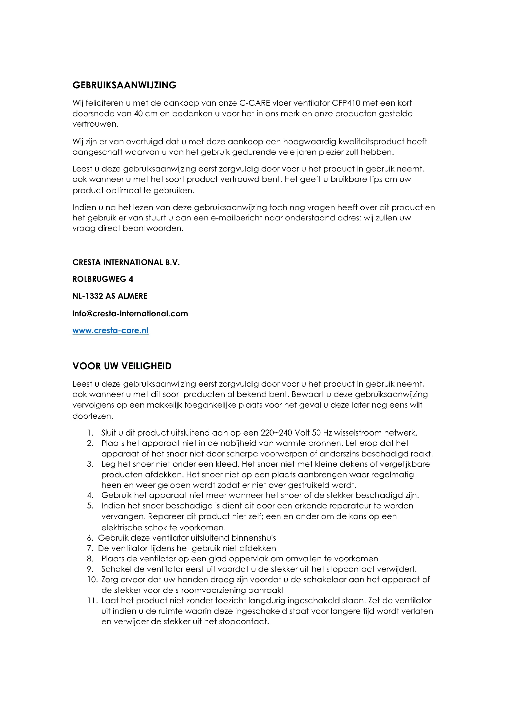 Wij feliciteren u met de aankoop van onze C-CARE vloer ventilator CFP410 met een korf doorsnede van 40 cm en bedanken u voor het in ons merk en onze producten gestelde vertrouwen. Wij zijn er van overtuigd dat u met deze aankoop een hoogwaardig kwaliteitsproduct heeft aangeschaft waarvan u van het gebruik gedurende vele jaren plezier zult hebben. Leest u deze gebruiksaanwijzing eerst zorgvuldig door voor u het product in gebruik neemt, ook wanneer u met het soort product vertrouwd bent. Het geeft u bruikbare tips om uw product optimaal te gebruiken. Indien u na het lezen van deze gebruiksaanwijzing toch nog vragen heeft over dit product en het gebruik er van stuurt u dan een e-mailbericht naar onderstaand adres; wij zullen uw vraag direct beantwoorden. CRESTA INTERNATIONAL B.V. ROLBRUGWEG 4