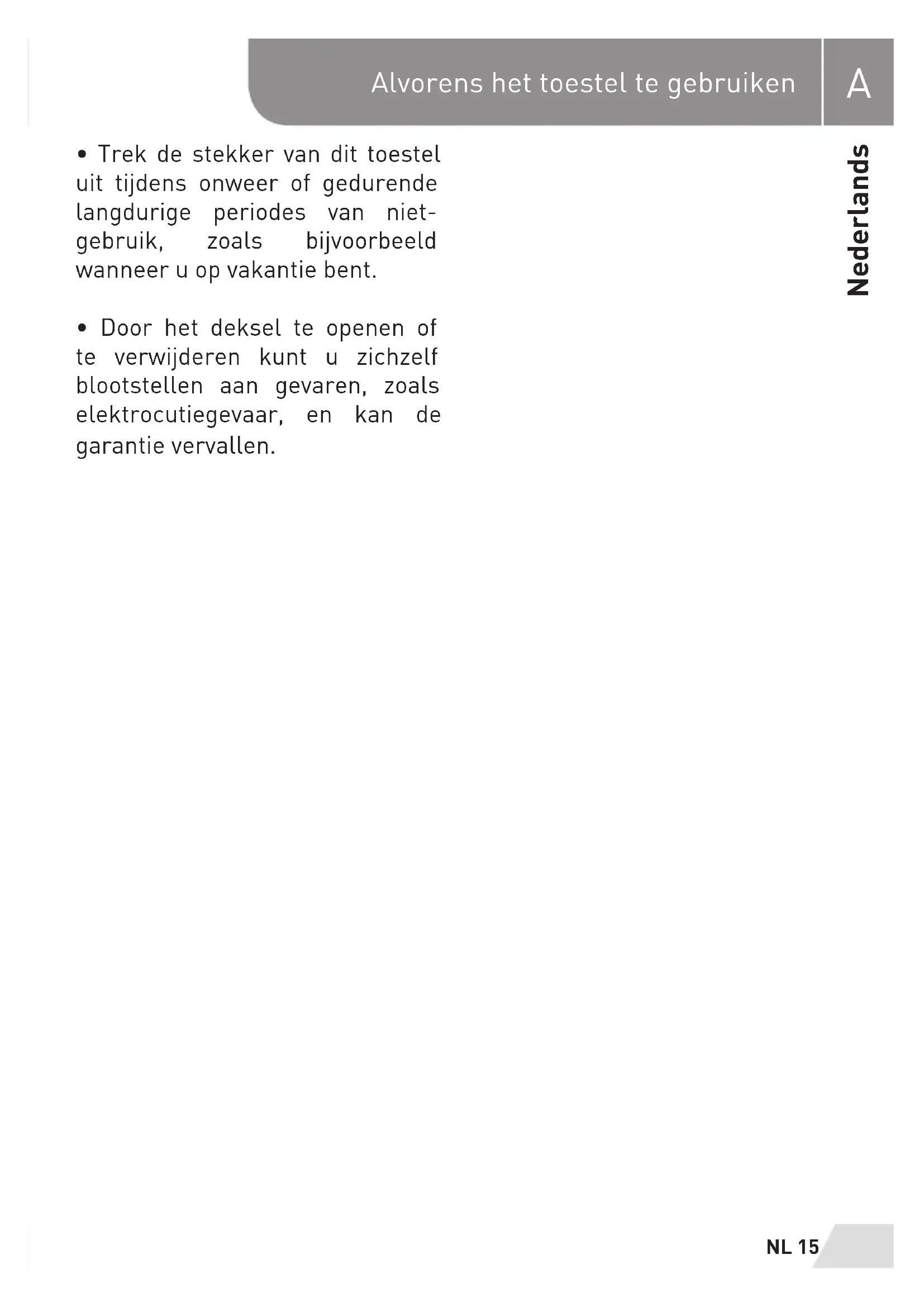 - Door het deksel te openen of te verwijderen kunt u zichzelf blootstellen aan gevaren, zoals elektrocutiegevaar, en kan de garantie vervallen.NL16